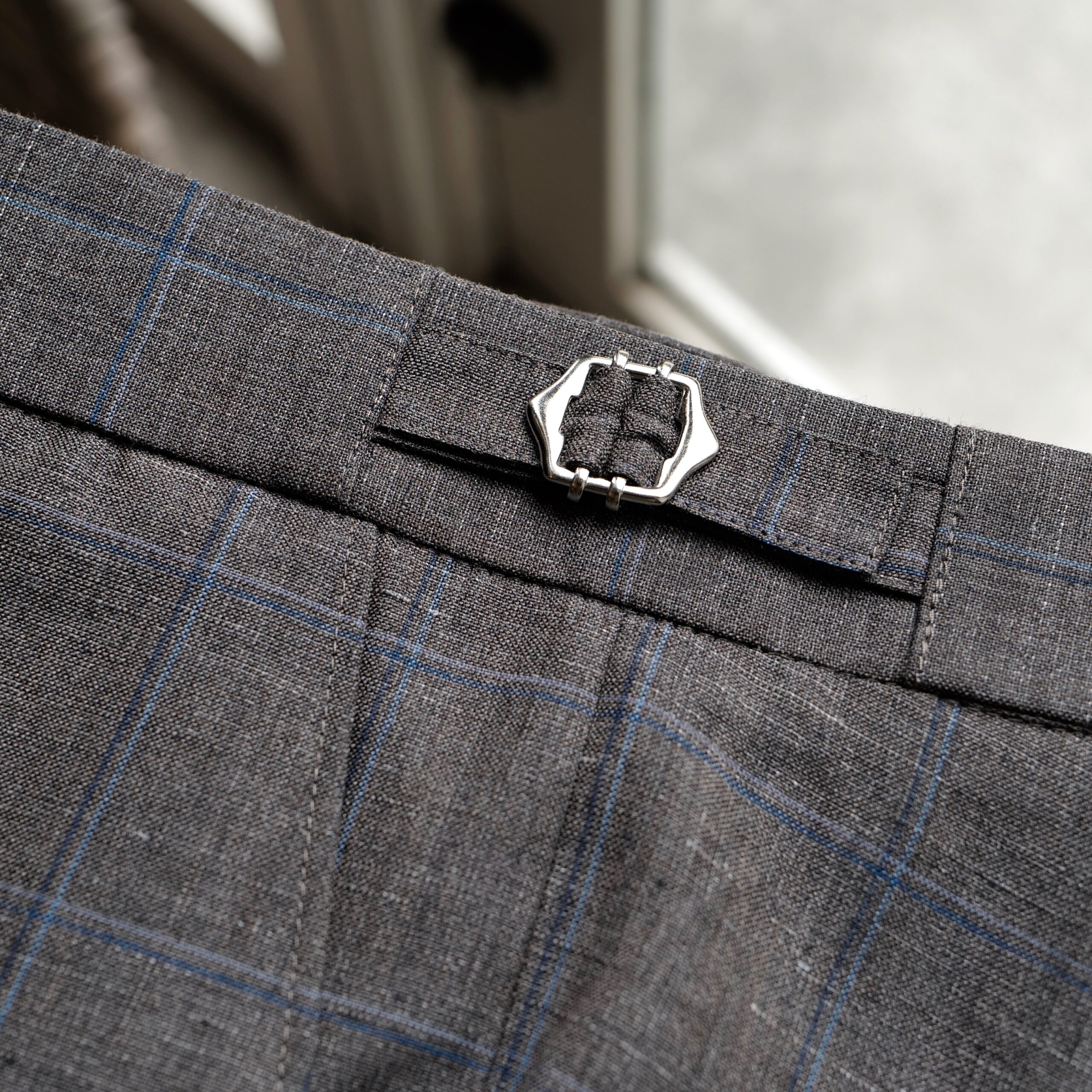 バックポケットは右側のみと英国ビスポークの技。 ブレイシーズ(サスペンダー)用の釦も施されています。
