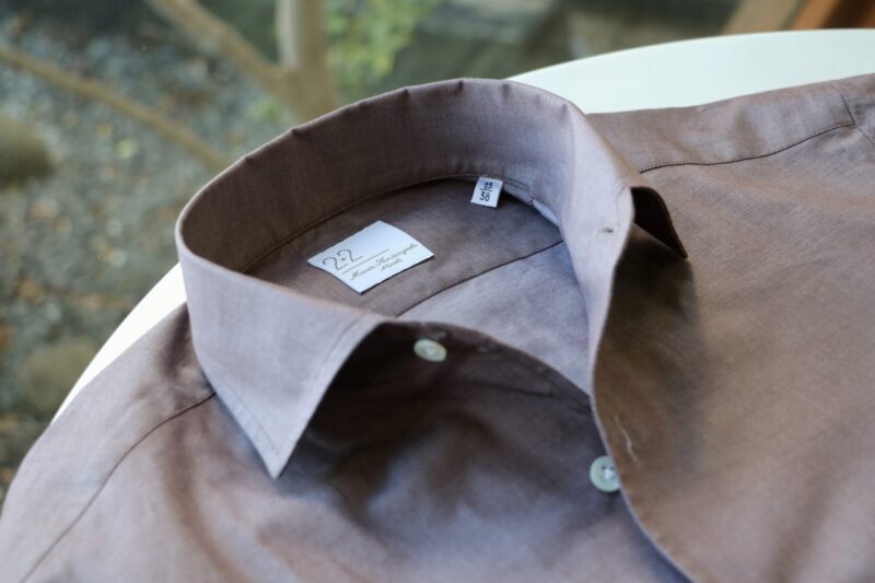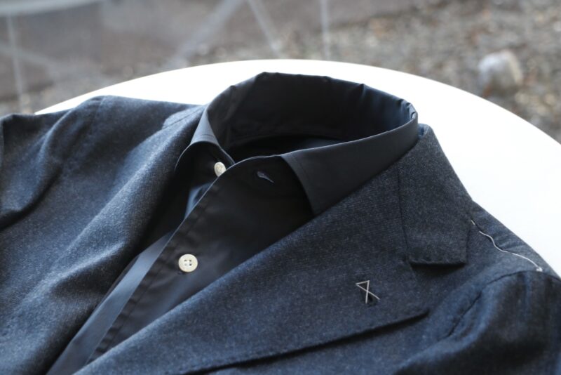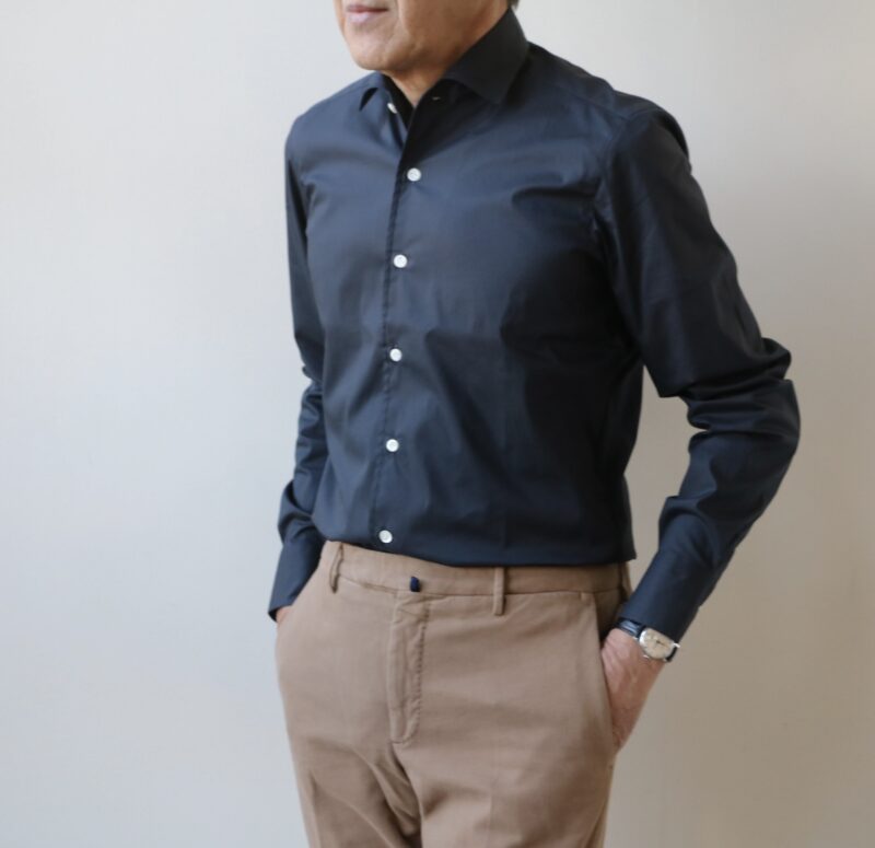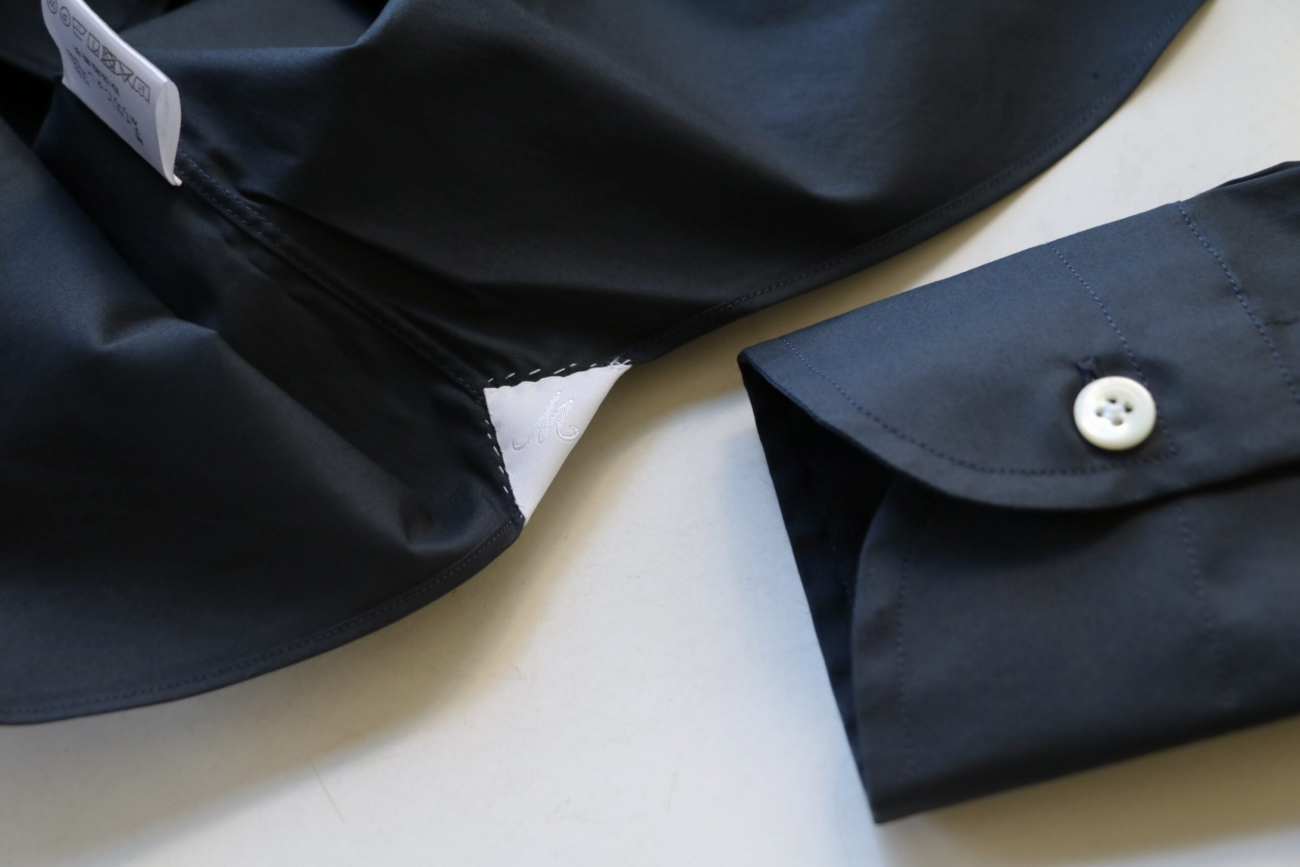 この黒に近いダークネイビーに惚れ込んでしまいました。迷うことなく選んだ襟型がワンピースカラーの「MARCELLO」。ストレッチコットンのポプリン生地になります。