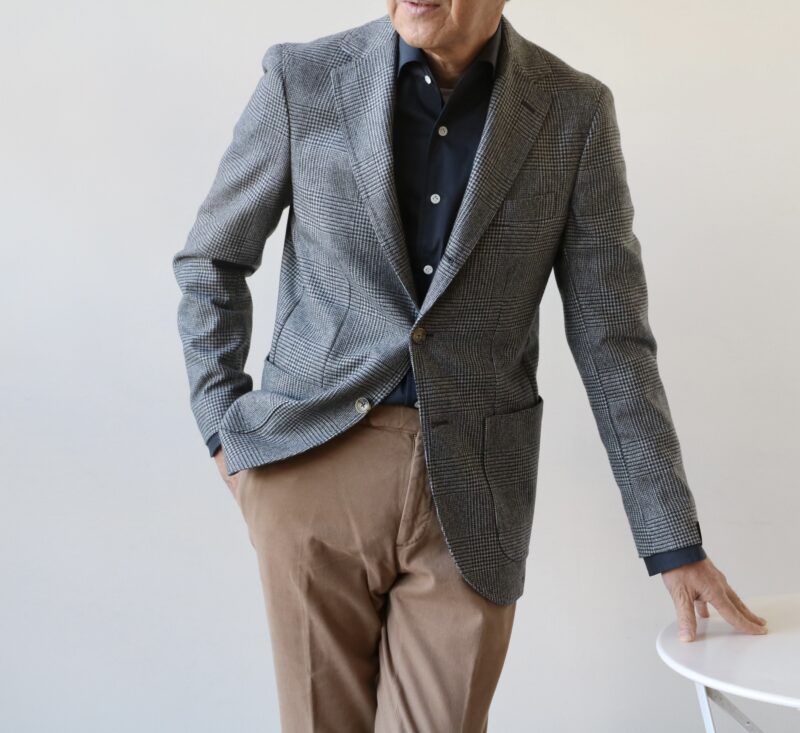 このジャケットも気になります。上のネイビージャケットと同じErrico Formicola/エリコ フォルミコラのものです。ボトムはグレイばかりではつまらないと、ブラウンカーキのキャバリーツイルをGTA/ジーティーアーからセレクトしました。