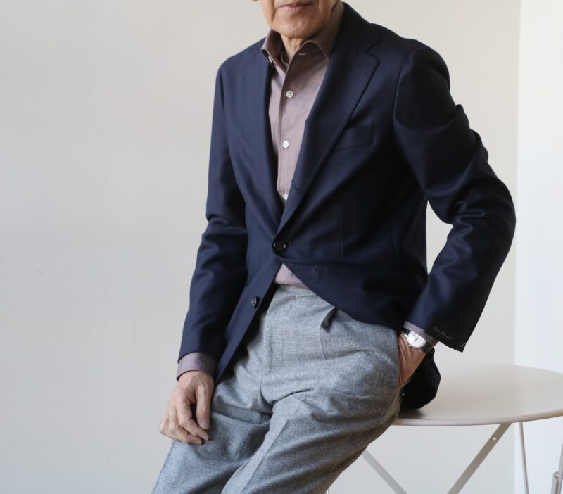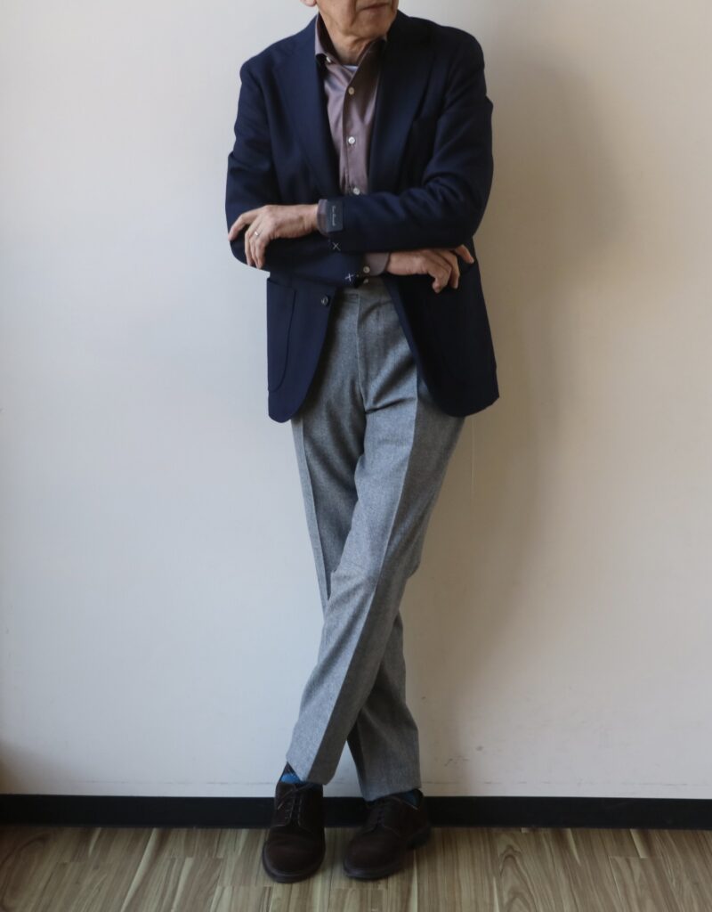 ご褒美候補に上がっているErrico Formicola/エリコ フォルミコラのネイビージャケット。断捨離しすぎたのでしょう。肝要なネイビージャケットがないのです。合わせたパンツはPT TORINO/ピーティートリノのトラベラーです。グレイの濃淡で合わせてみました。