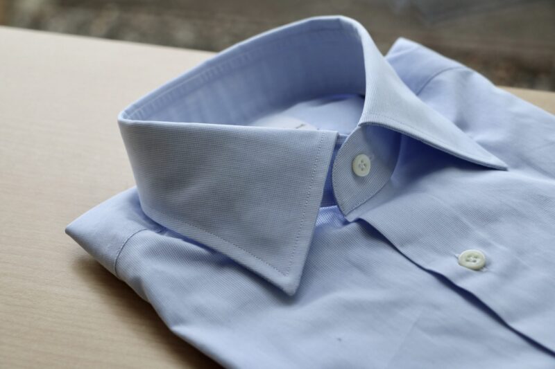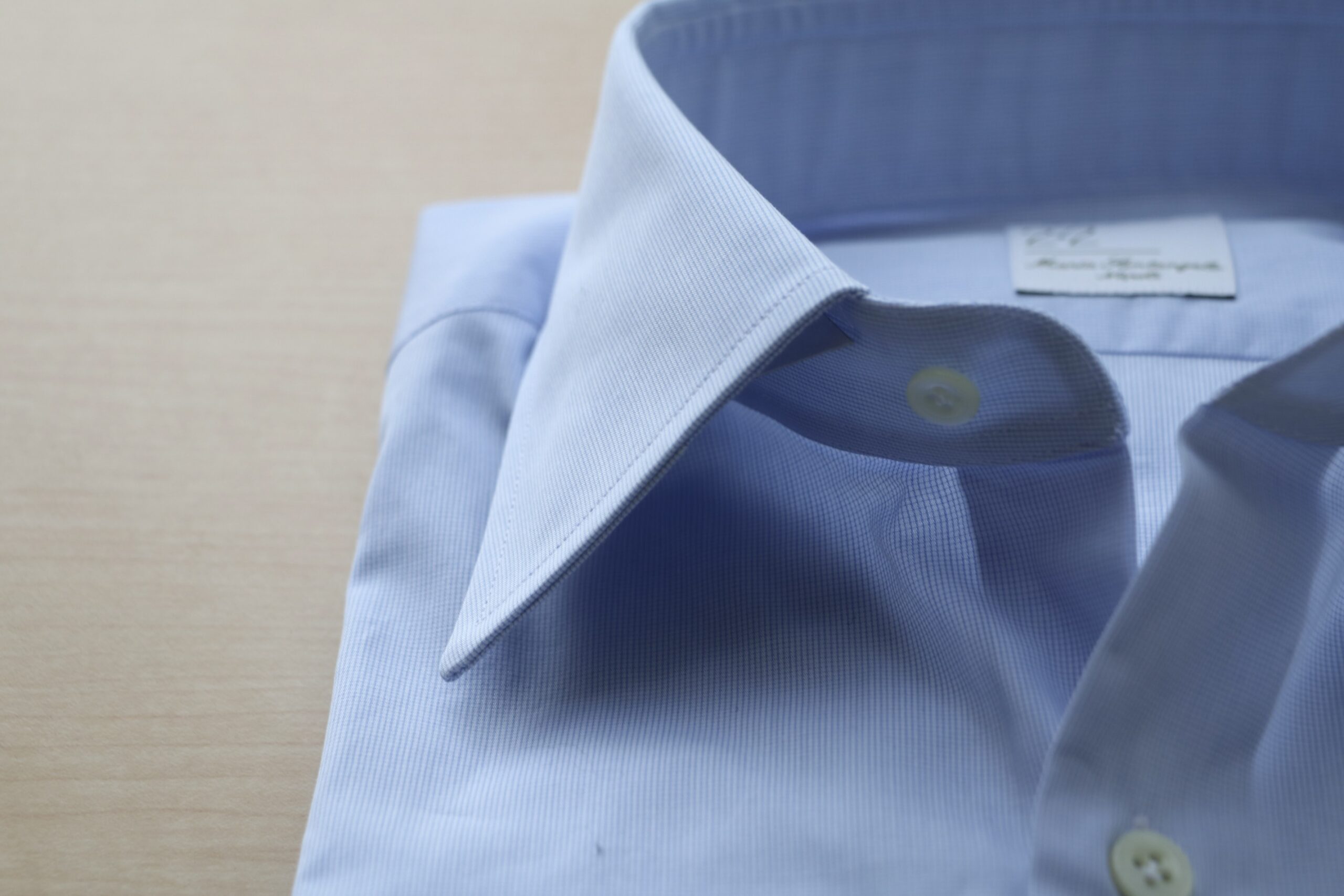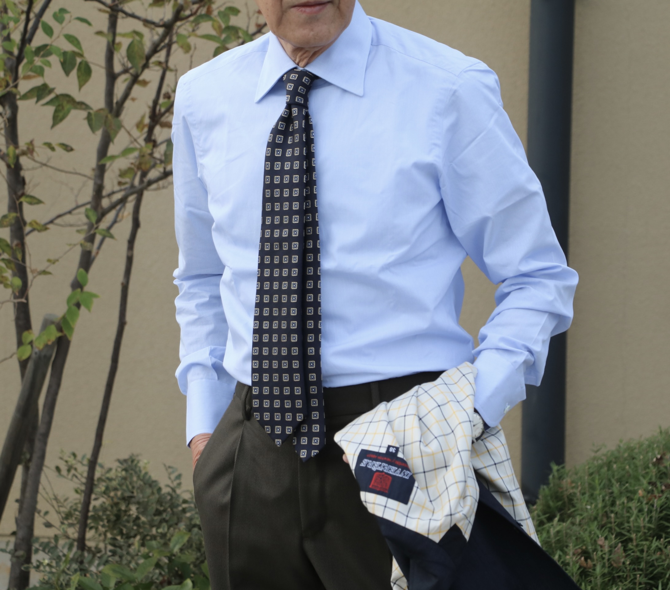 ドレスシャツの中ではもっともスタンダードで、フォーマル度の高いブロード。同じ太さの縦糸・横糸を使用し、縦糸を横糸の2倍ほどの密度に織り上げた平織りの生地です。いざという時のお客様の為に、必ず店頭に揃えておかなければならないドレスシャツです。襟型はセミワイドの「FRANCO」。英国のアイテムとの相性はいかがなものでしょう。検証してみます。
