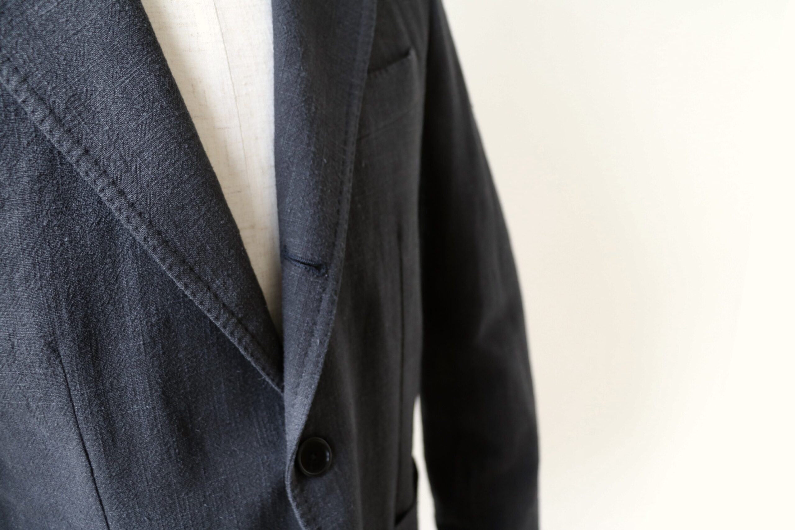 スーツにはないスポーティーなホップサック。メッシュ状の凹凸感のある平織の生地で、通気性もよく、シワになりにくく丈夫と、ビジネスにも、そして旅行などのオフに使うのに適した素材です。夏を通してスリーシーズン使えるジャケットとしてネイビーの次に揃えておきたくなるジャケットです。