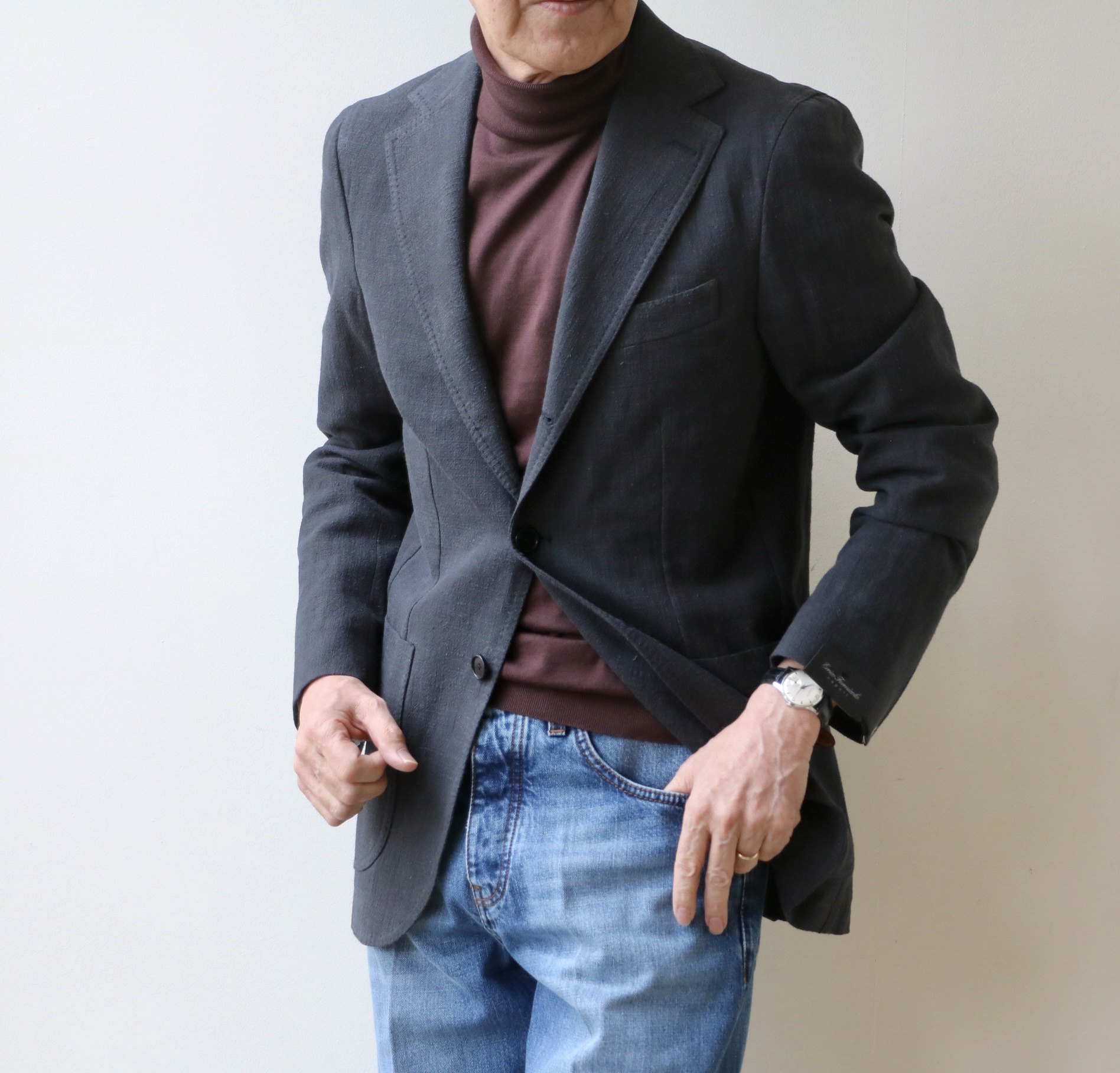肩線を内側に入れながら、ウエストの絞りは緩やかで、着丈はやや長めな直線的なフォルムが特徴です。細身でも、昨今の緩めでもとボトムを選ばないモダンなジャケットになります。個人的にはフロントボタンを開けた際のシルエットが好みです。