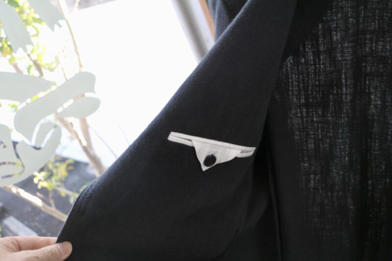 背中の上部と前身・細腹に付いている背抜き仕様になります。裏地がない分、通気性に優れていて涼しく、ジャケット自体の重量も軽くなります。高温多湿な日本の夏に適した仕様だと言えるでしょう。