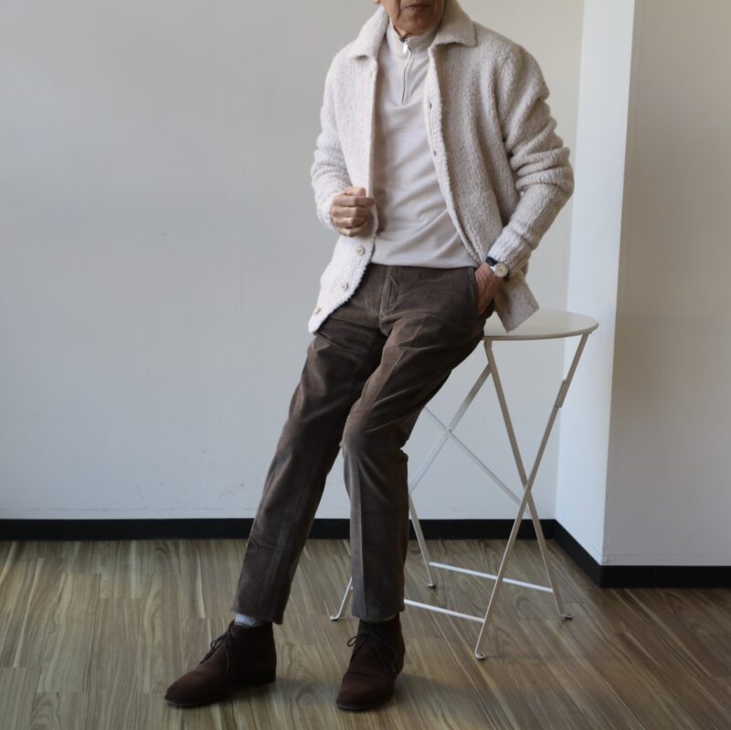 同じ暖色のブラウンのコーデュロイパンツに白地のシャツでフレッシュさを強調。配色のベージュが全体をまろやかにまとめ上げてくれます。