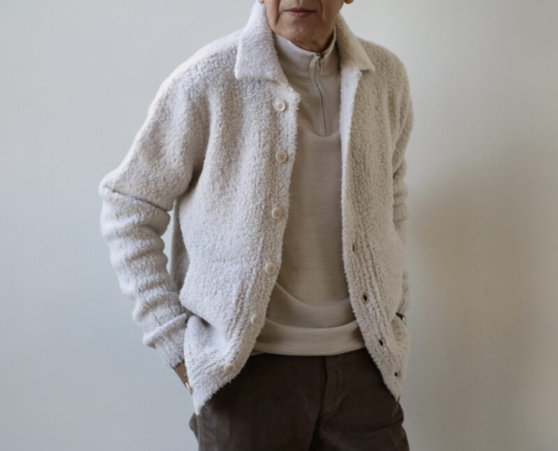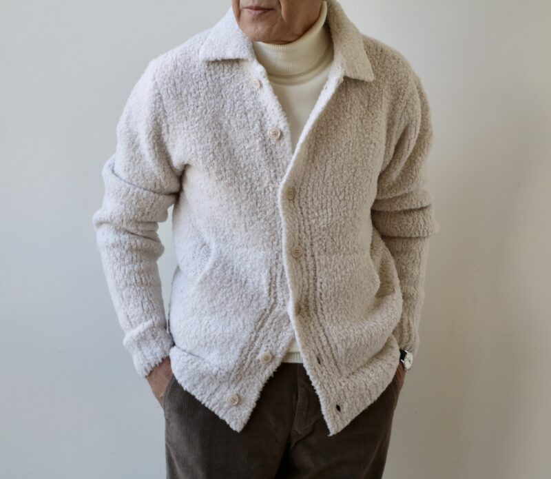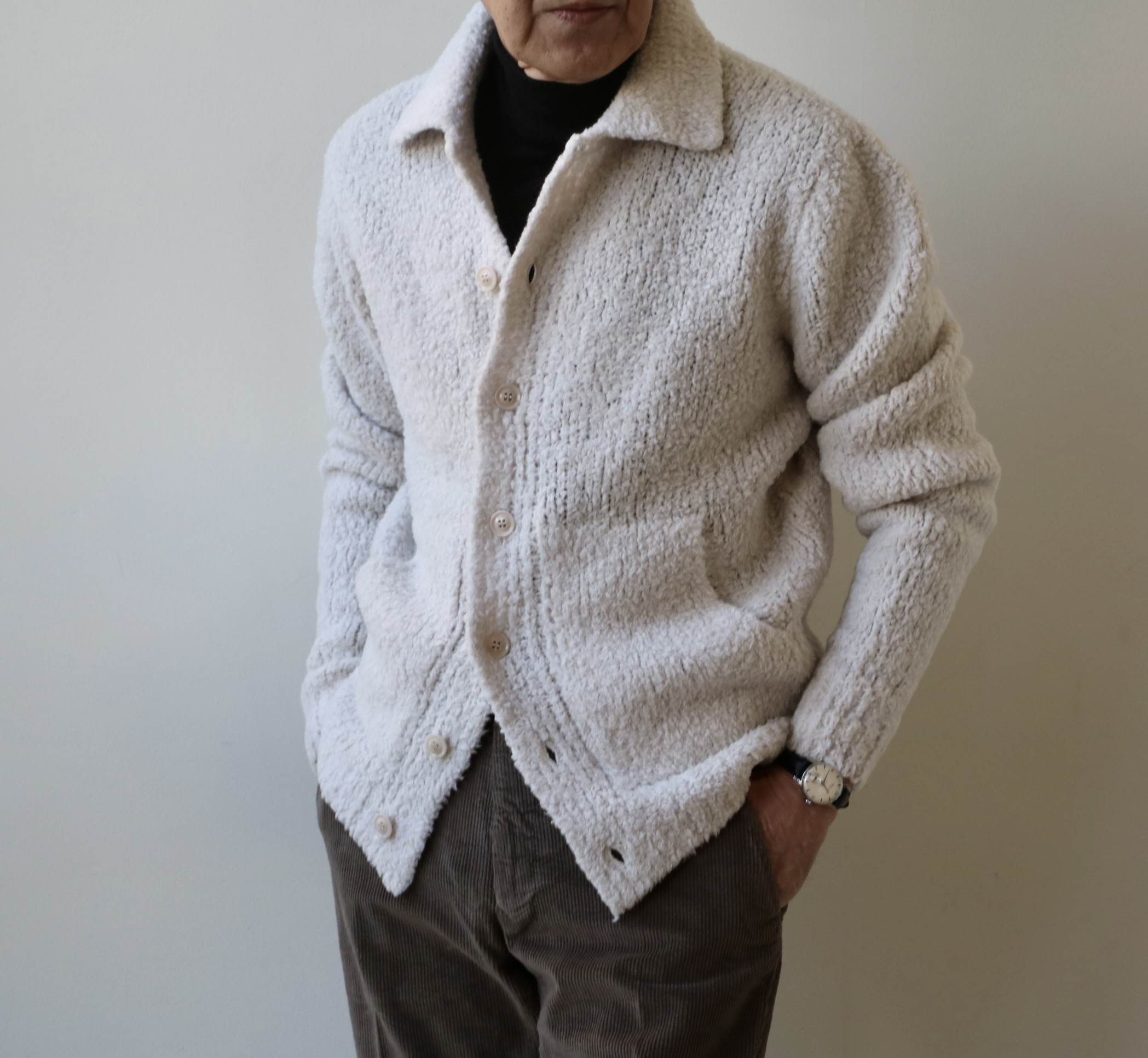 ホッキョクグマです。デザインも変わり、襟付きのボタンカーディガンになります。ウールメインのループヤーンは空気を多く含む分、軽くて保温性があります。オフホワイトであれば、さらに優しい風合いを演出します。