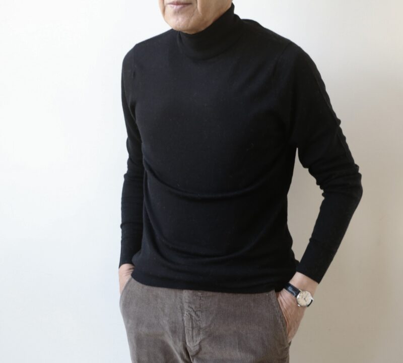 昨年、ネイビーはセレクトしましたが、迂闊にもブラックを外してしまった8ゲージメリノウールタートルネックセーター。ネイビーとは色のイメージが大きく変わるブラック。他の色では代用のできない雰囲気を作り出すブラック。シックな組み合わせに欠かせないカラーです。