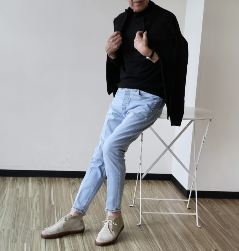 ラフ度の高いブリーチブルーデニム。面白くするなら、トップスとのギャップでしょうか。ジャケットに合わせる気分でなければ、ツインニット。同じ生地でなくても、同じ色合いでまとめるとシックで上品なコーディネートが出来上がります。フルジップのカーディガンあたりがちょうど良さそうです。