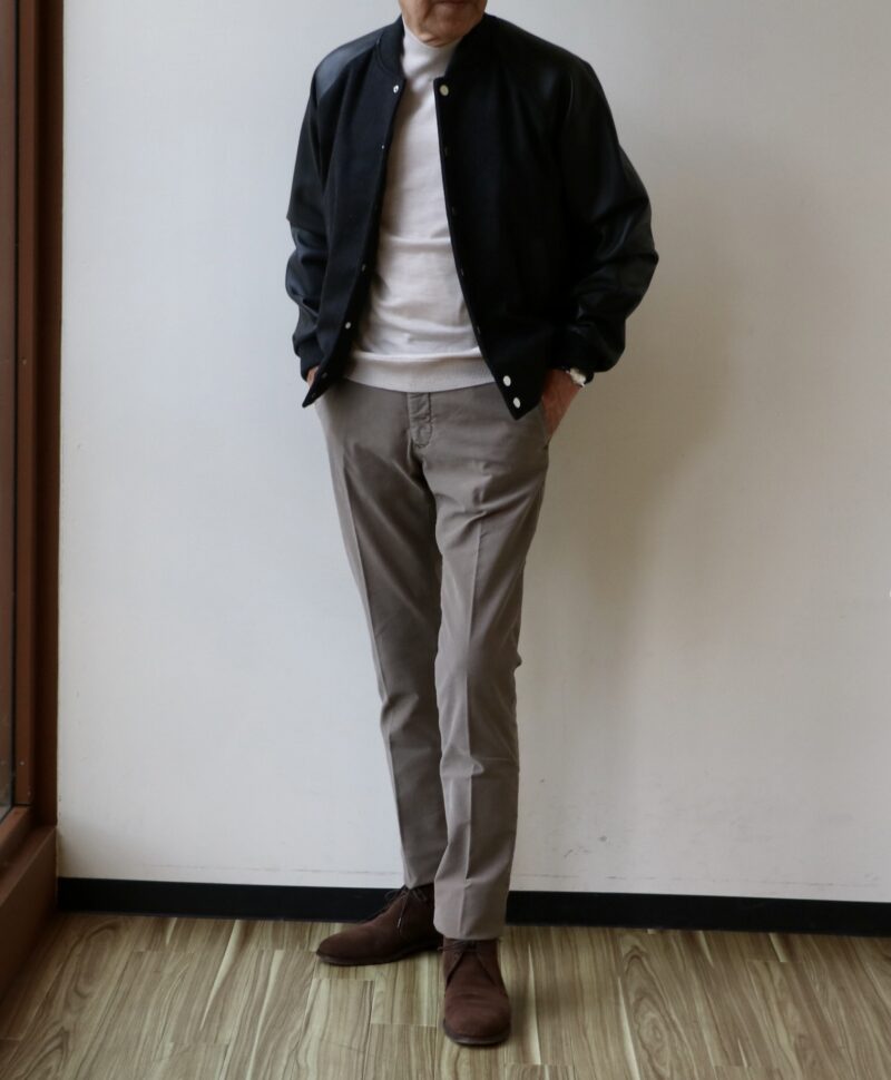 インコテックスの「100番」チノに合わせたいのが、ウールメルトン×ラムレザーアワードジャケット。ウール部分がブラックではなくチャコールグレイであることがセクシーに魅せる重要なポイントです。黒黒では素材のコントラストがつきにくく、他のアイテムに合わせた時に強すぎてしまう嫌いがあります。ただ、これは個人的な意見です。好みはもちろんありますので、一概に言えないかもしれません。
