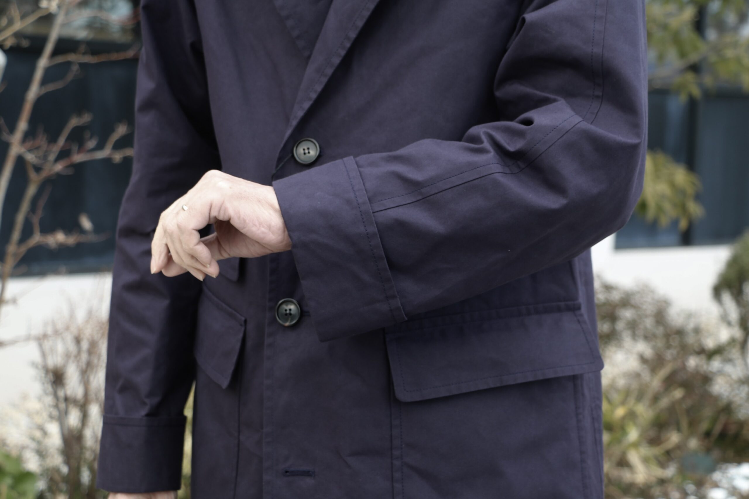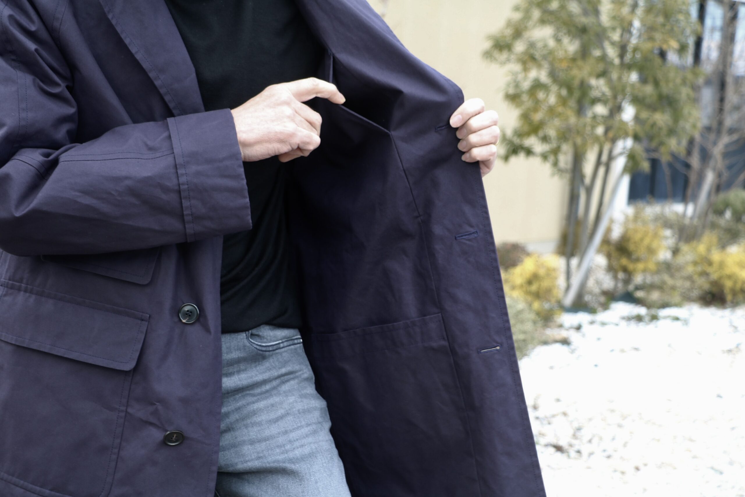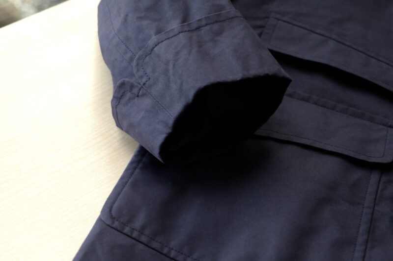 立体感のある表情を作り出すのは、ワックスコットンという生地。高密度のコットン生地にワックスを染み込ませ、防水性、撥水性、耐久性を高める伝統的な手法です。ただ、バブアーにみるハードさはなく、ライトな生地感で、ベタつきや匂いもほとんどなく、ドライワックスといっても良いかもしれません。