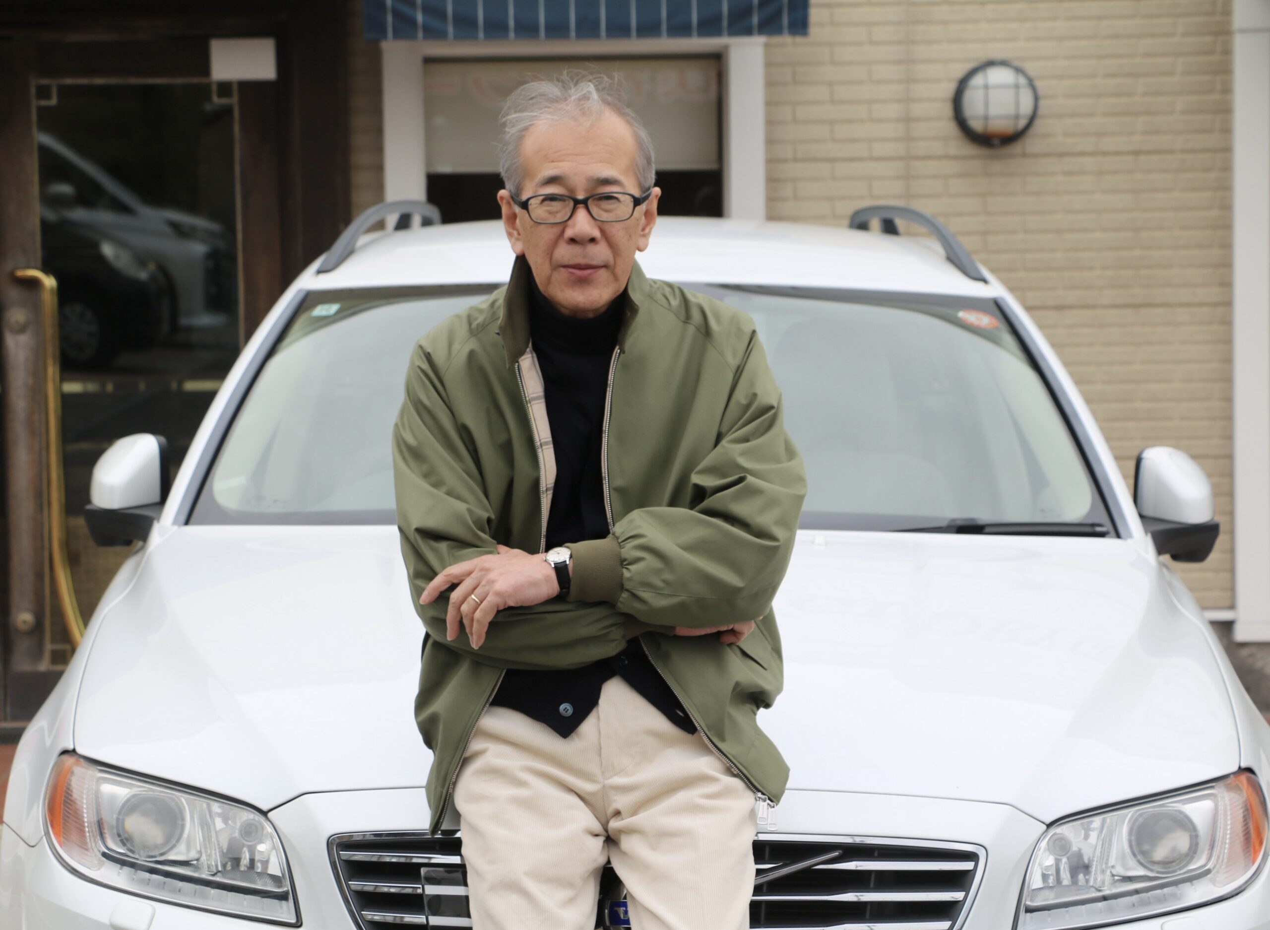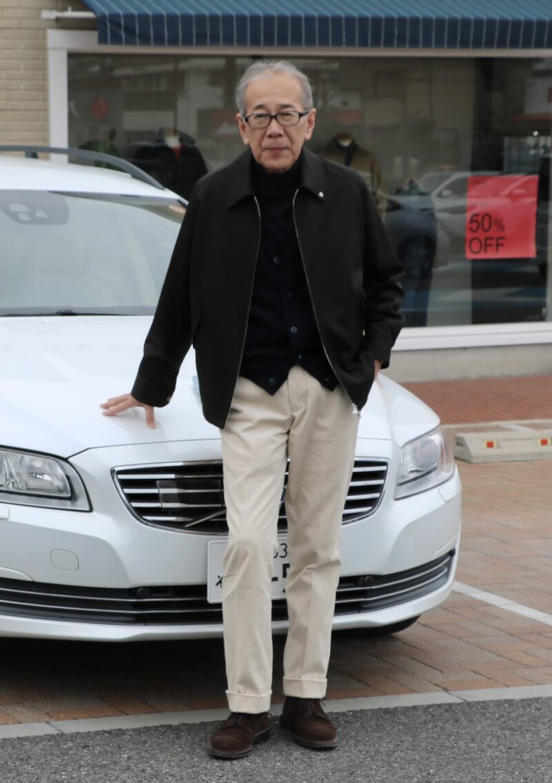 かつては英国車。今はボルボです。12年間愛着をもって乗っている「V70」です。この日の撮影もあり、本日の出立は全て英国もの。コットンのタートルネックはジョン・スメドレー、ラムズウールのカーディガンはウィリアム・ロッキー、コーデュロイパンツはコーディングス、靴はクロケット&ジョンズです。