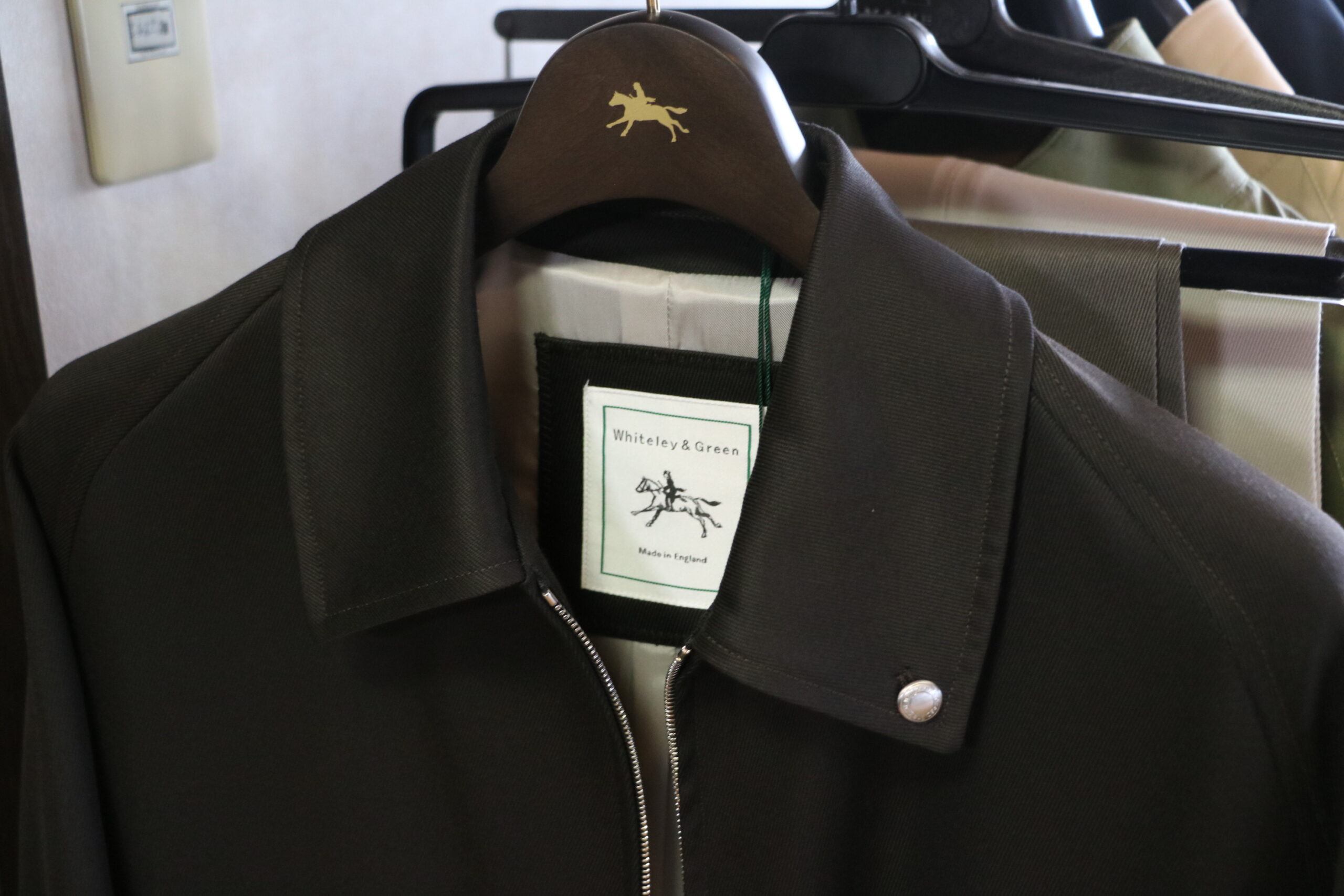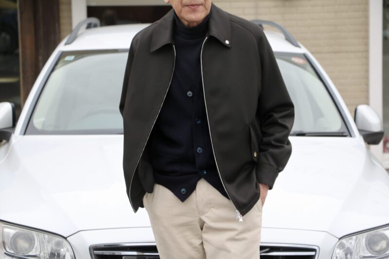 羽織っているのは、今、最も注目されている【Whiteley&Green/ホワイトリーアンドグリーン】。クラシコ好きをも巻き込んでいるといっても過言ではありません。その魅力は、Cavalry twill(キャバリーツイル)という伝統的なファブリックです。デビュー当時からカシェートで取り扱っていますが、その人気は年々高まっているようです。私が着用しているのはモデル名「Birkby」。クラシックなドライビングジャケットになります。私が車を背景に写真を撮った理由がお分かりになっていただけるでしょうか。英国車の方が似合う?いやいや、そんなことはありません。クラシックなデザイン、生地ですが、不思議にモダンなんです。