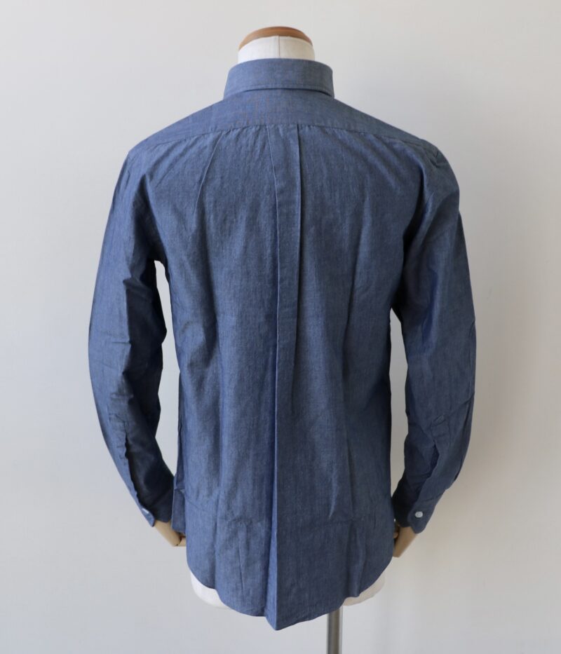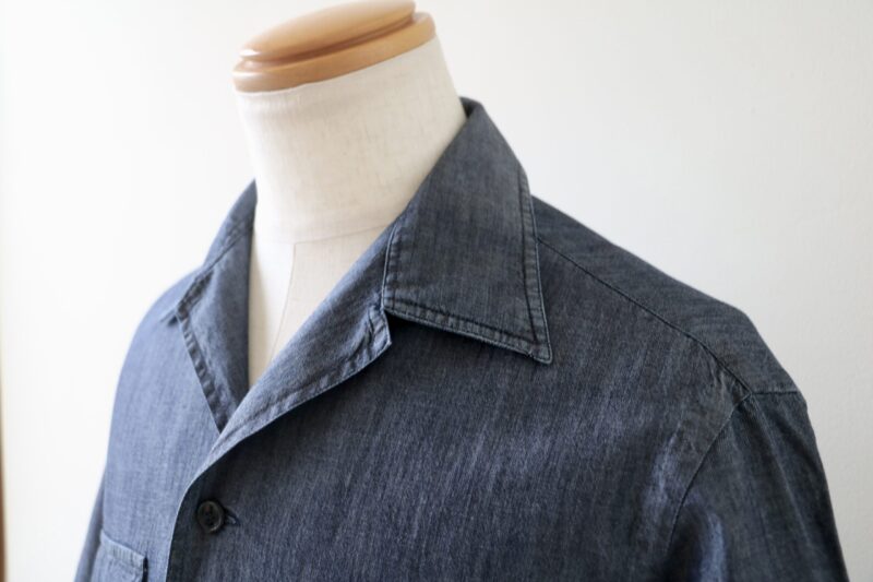 XACUS/ザッカスのデニムシャツと比べてみましょう。綾織りのデニムには厚みが出ます。色糸部分が多くなるデニムに対して、平織りのシャンブレーは白糸部分が多く、生地も薄くて軽快な着心地です。耐久性に優れ、通気性が良いため、シーズンレスで着ていただけます。