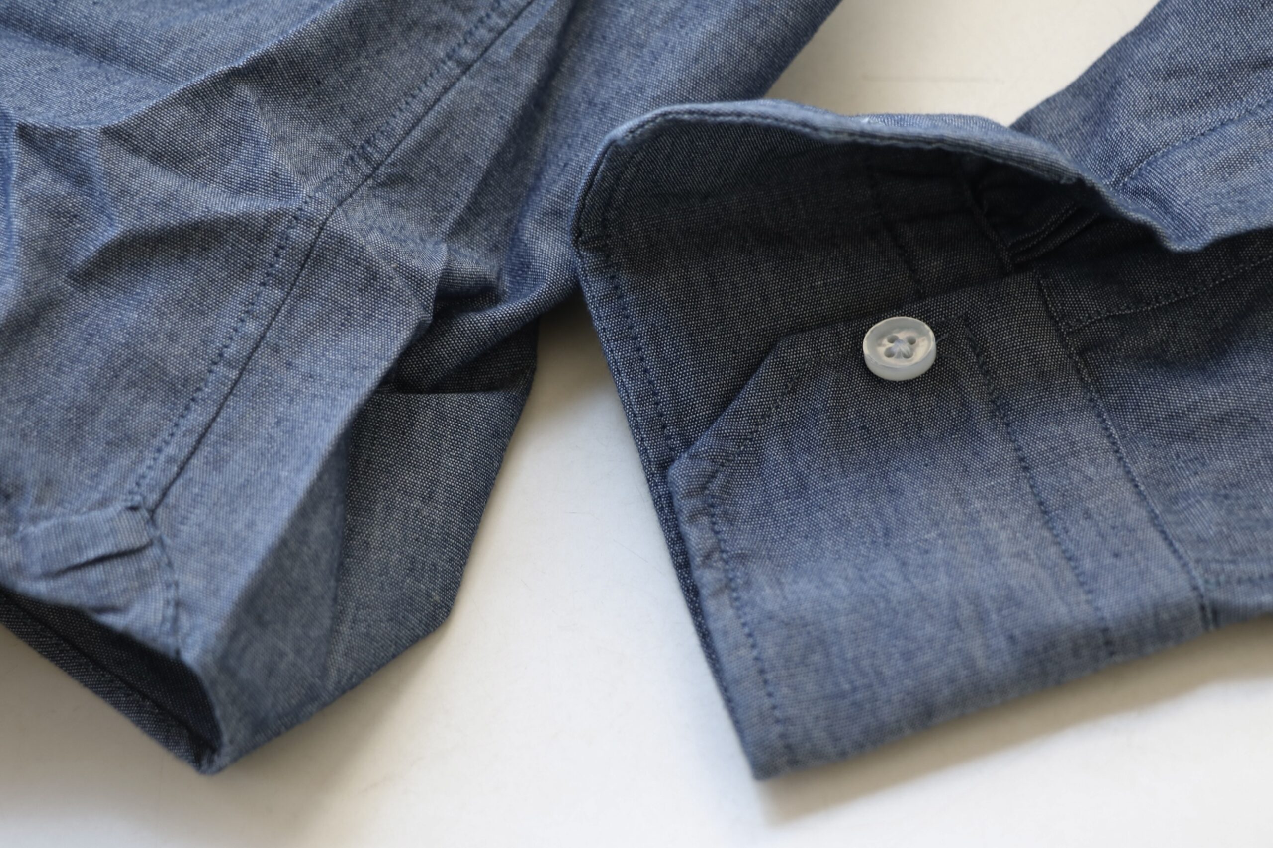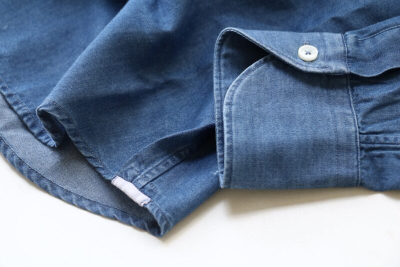 横糸が白糸、縦糸が色糸とデニムと同じですが、織り方が異なり、デニムは綾織り、シャンブレーは平織りになります。色落ちするデニムに対して、シャンブレーはほとんど色落ちしません。