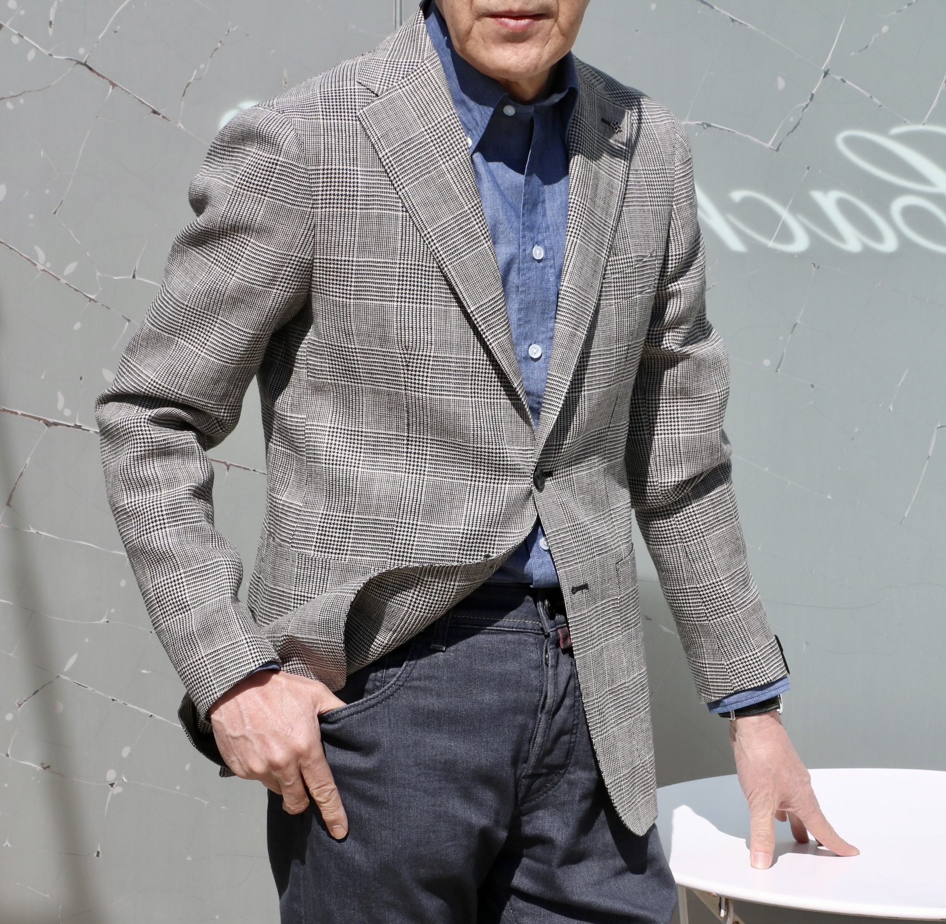 迷わず、羽織ったのは【CORDINGS/コーディングス】カシェート別注のグレンチェック柄サマーウールハンティングジャケットです。この秋冬はハリスツィードのグレンチェック柄でご提案したところ、大きな反響がありました。おかげさまでで完売となり、お求めいただいた方々に深くお礼申し上げます。今季もすでに全国からお便りをいただいており、店頭でもご購入やご予約してくださりと、幸先の良いスタートです。昨年、リネン素材でご購入された方が多く、雰囲気の異なるサマーウールでのご提案が良かったのでしょう。そして、なんと言っても魅力は価格。素材も為替も高騰する中、96.000円(本体価格)と10万円アンダーでご提供できるのは、別注だからです。カシェートバイヤーの良心?かもしれません。こちらの商品は、グローリーガイの店頭でもご覧になれます。