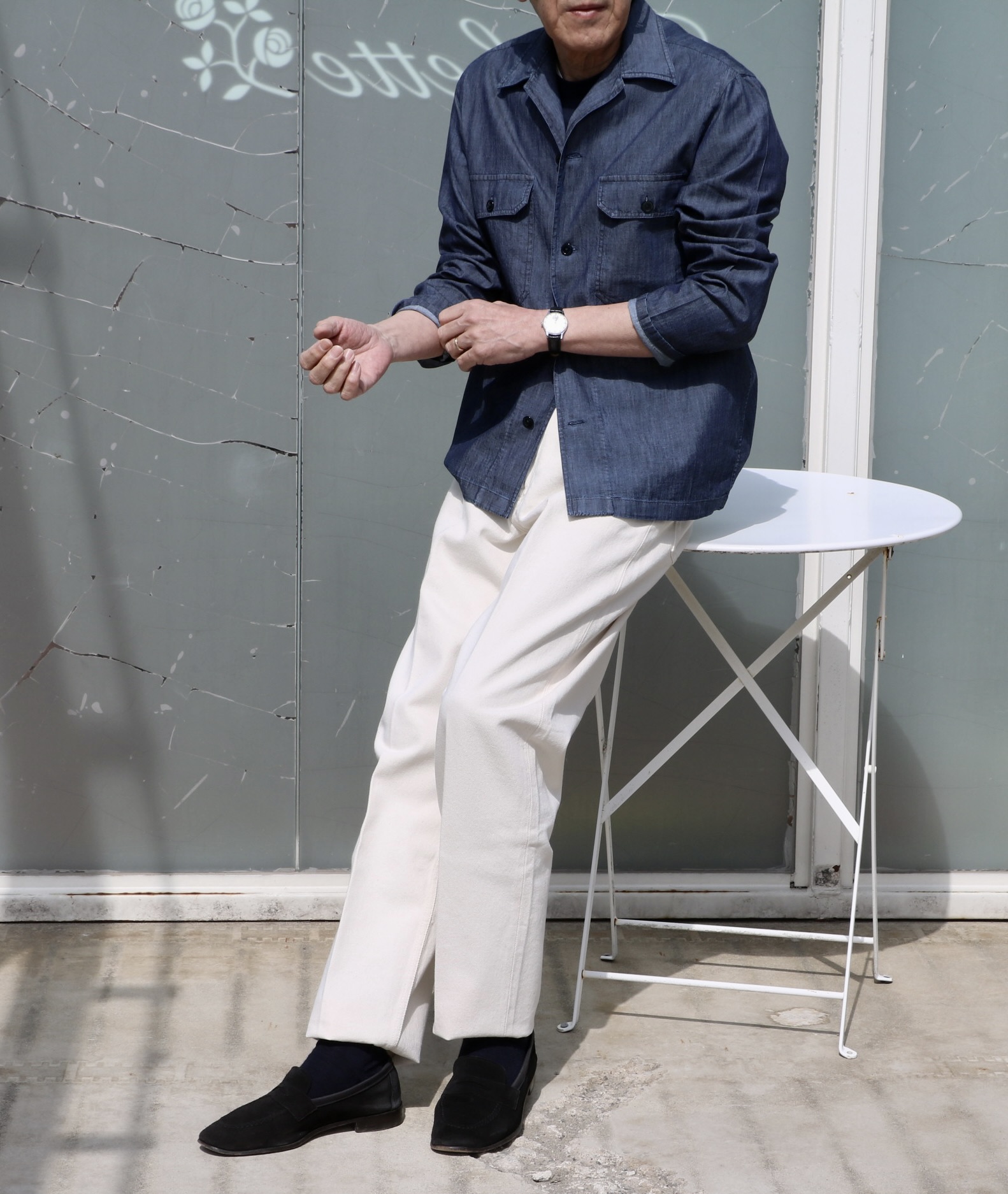 同じ組み合わせでもシャツの色をホワイトからインディゴブルーに変えるだけで、ラフな印象になります。この2種類のシャツを持つていれば、コーディネートに悩まなくて済むはずです。