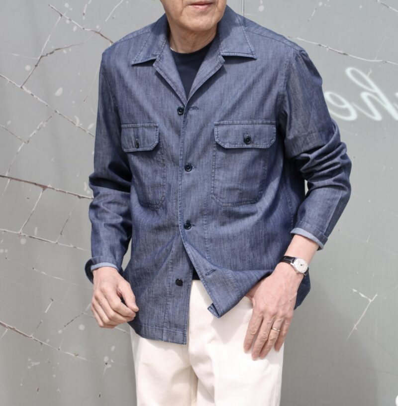 テーラードのジャケットよりラフで、シャツよりもきちんと感のあるシャツ仕立てのジャケットです。両腰についたパッチポケット仕様のシングル三つボタン。ボタンを留めるとすれば、真ん中です。