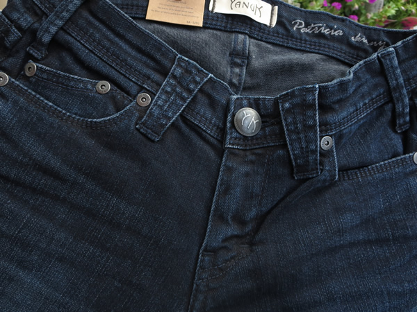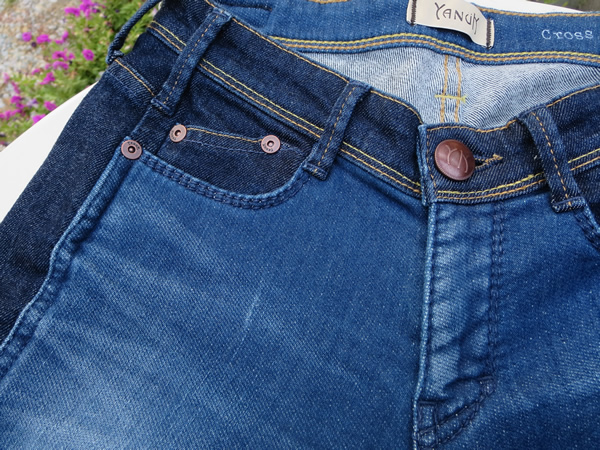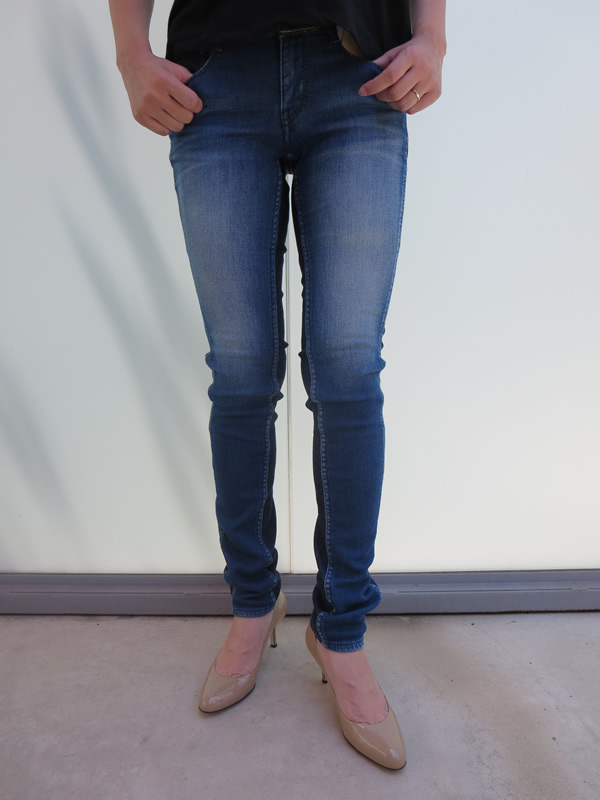 前側がデニット(昨日のブログでご紹介しました新素材)、後ろ側がデニムという異なる2つの素材を組み合わせた“クロスメイド”。切り替えのラインを少し前側に寄せて、色の薄い前身頃のデニット部分を細くする事で脚を細く見せてくれる効果アリ!