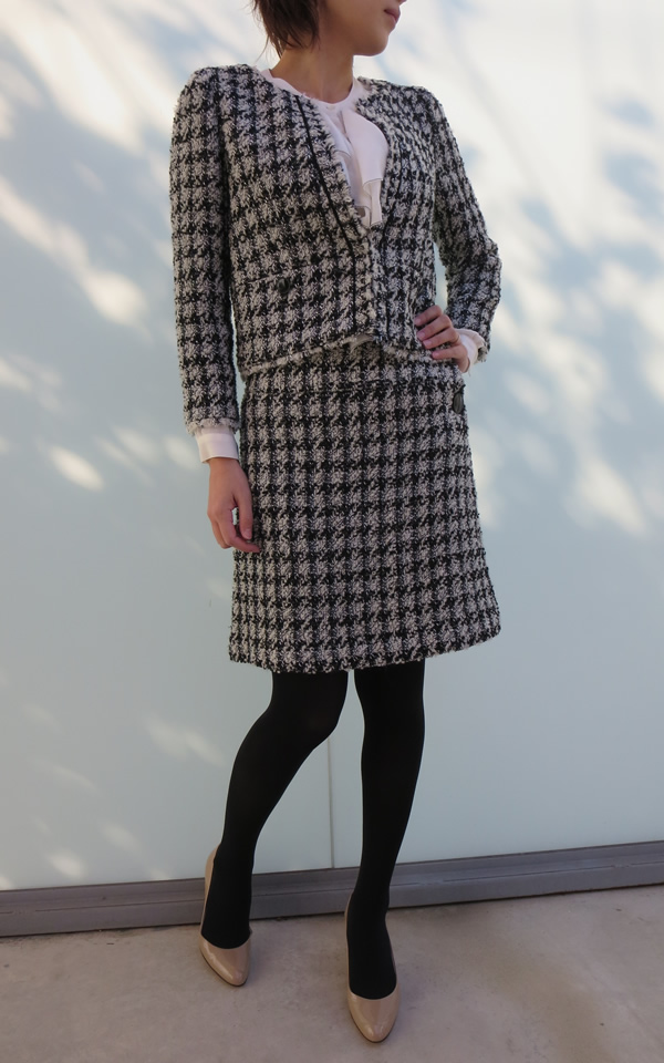 こちらは、セットアップでご紹介させていただきます!白黒の千鳥格子が素敵なファンシーツィードで仕立てられたジャケット&スカート。ジャケットは、ざっくりとしたツィードの雰囲気に合わせ、共地で作ったフリンジでトリミングした手の込んだ1枚です。スカートは、セミフレアのシンプルなスタイルで大人可愛い雰囲気です。