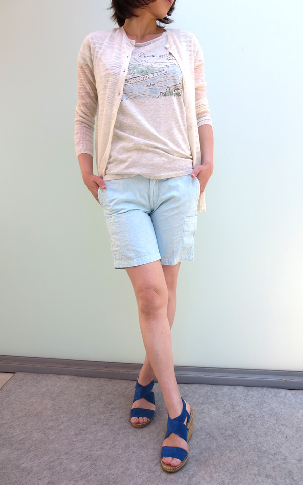 こちらも上と同じ素材、リネンスラブのニットカーディガン。肌にまとわりつくことなく、さらりとした着心地なので、冷房対策に是非、お勧めです!ボトムを選ばない定番クルーカーデの着まわし力の高さもGOOD!