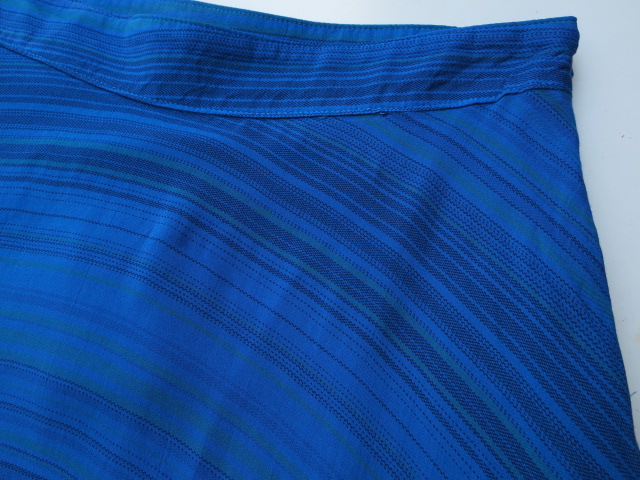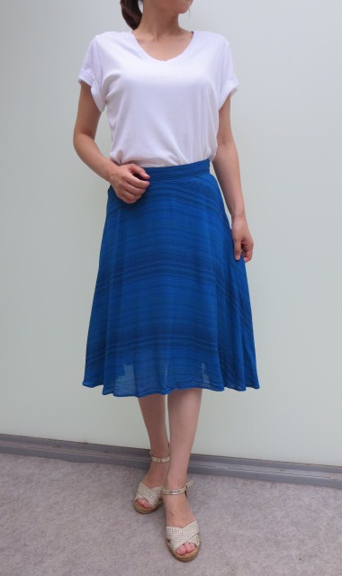 トップスのTシャツは、シンプルですが、袖口をロールアップさせたデザインでこなれた雰囲気。それに合わせたスカートは、細やかなストライプと絶妙な色合わせが素敵なAラインスカートです。極薄のレーヨン100%素材は、滑らかな質感で、上品且つ繊細なイメージです。爽やかで、涼しげな雰囲気が、夏にピッタリ!