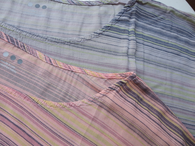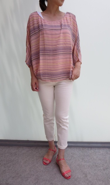 上のスカートの同素材で仕立てられたトップスもございます!カラーが変わると雰囲気も全く変わりますね。優しい色使いのストライプ柄&ふんわりシルエットが、大人カジュアルのこなれ感を醸し出してくれます。色は、ピンク系、グレー系の2色。