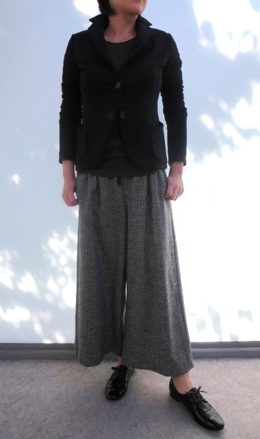 バランサーキュラーという希少な編み機で、作られている生地を使用しているワイドパンツ。ニットと織物が融合した新感覚の素材なんです。軽くて、チクチク感も全くなく、穿着心地は◎。ウエストはゴム仕様なので、楽ちんに穿いて頂けます!千鳥格子柄が、今の気分。