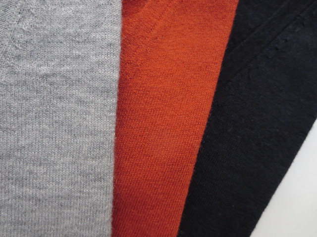 上に羽織っているニットアウターは、"three dots"で、既にご紹介済み。今日は、その中に着ているVネックニットをご紹介したいと思います!毎年定番人気のハイゲージメリノウールシリーズ。保温力と吸湿性に優れたメリノウールですが、カットソー感覚で、さらりと着こなせる為、今すぐに重宝します!色は、グレー、オレンジ、ネイビーの3色です。シンプルで、使い易いので、何枚あっても良い感じ。