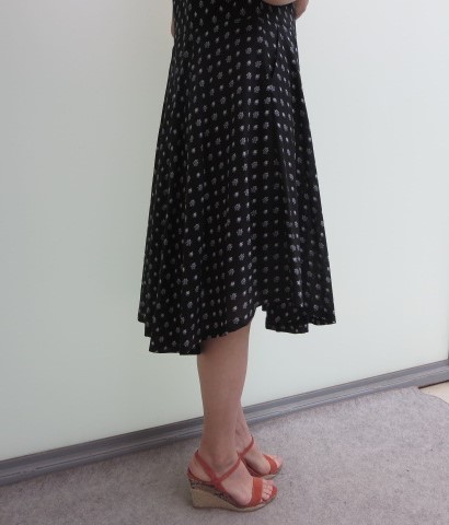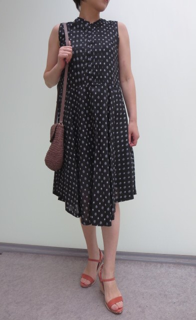 こちらは、上のブラウスと同じ素材のプロヴァンス柄ワンピース。前身ごろにピンタックが入って、スカートの裾がイレギュラーになっています。風に揺れるカンジが素敵ですよ!