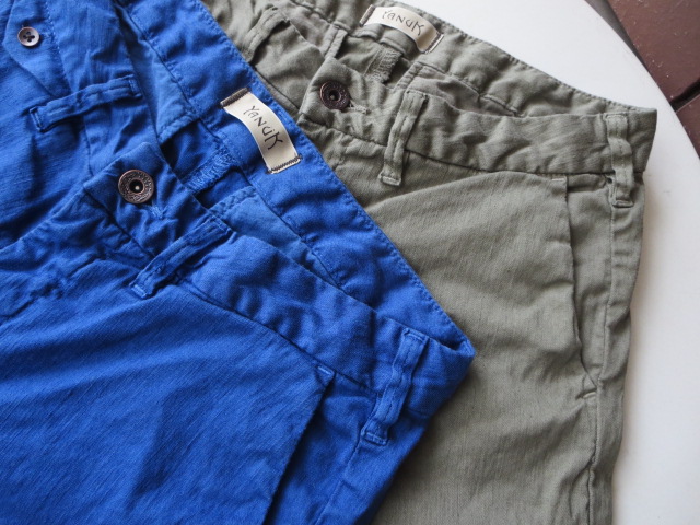同じシルエットで、こちらは、コットン・リネン混のCHINO。鮮やかなブルーと大人っぽく穿けそうなカーキの2色展開。ストレッチが効いて、体に馴染み、動きやすい1本です!