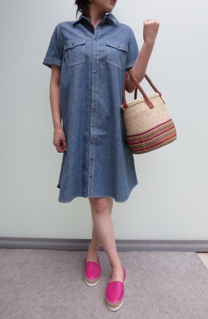 コットンのリサイクル糸のネップが入った雰囲気あるインディゴダンガリーのシャツワンピース。まさに今年のトレンドは、デニム!Aラインシルエットで、重ね着もし易いこの1枚は、絶対おススメ。長Tなど重ね着すれば、秋までしっかり使えそう。