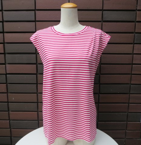 レーヨン・ポリウレタン素材の落ち感のある細ボーダーのカットソーシリーズ。こちらは、フレンチスリーブで、左肩にタックが入っているお洒落な1枚。ノースリーブは、ちょっと苦手という方にはおススメ!生地が柔らかいので、着心地は抜群です。色は、レッド、ベージュの2色。