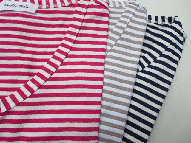 最後は、同じく細ボーダーの長袖カットソー。少し着丈が短いので、スカートやワイドパンツなど合わせると◎。タンクトップをインナーに重ね着しても良いですね。色は、レッド、ベージュの2色。