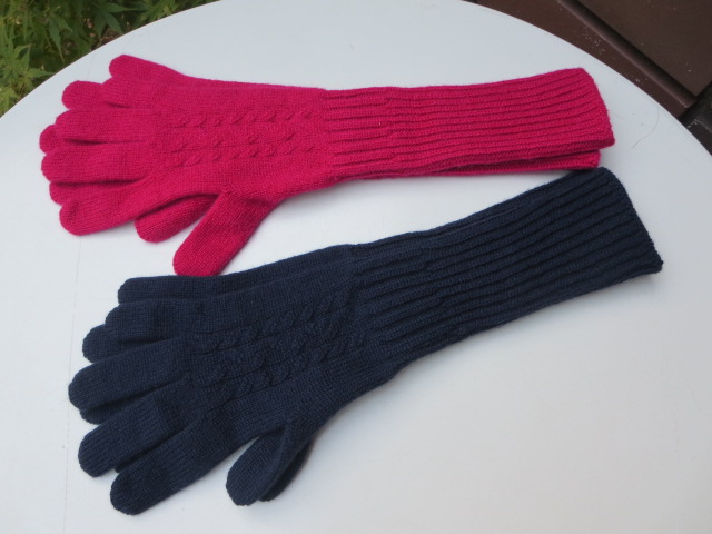 カシミア100%のケーブル編みがポイントのニットグローブ。こちらも長め丈でしっかりと寒さから守ってくれます。折り返して使って頂いても◎。色は、可愛らしいクランベリー、ネイビーの2色。