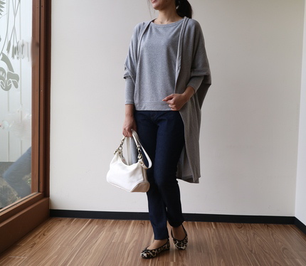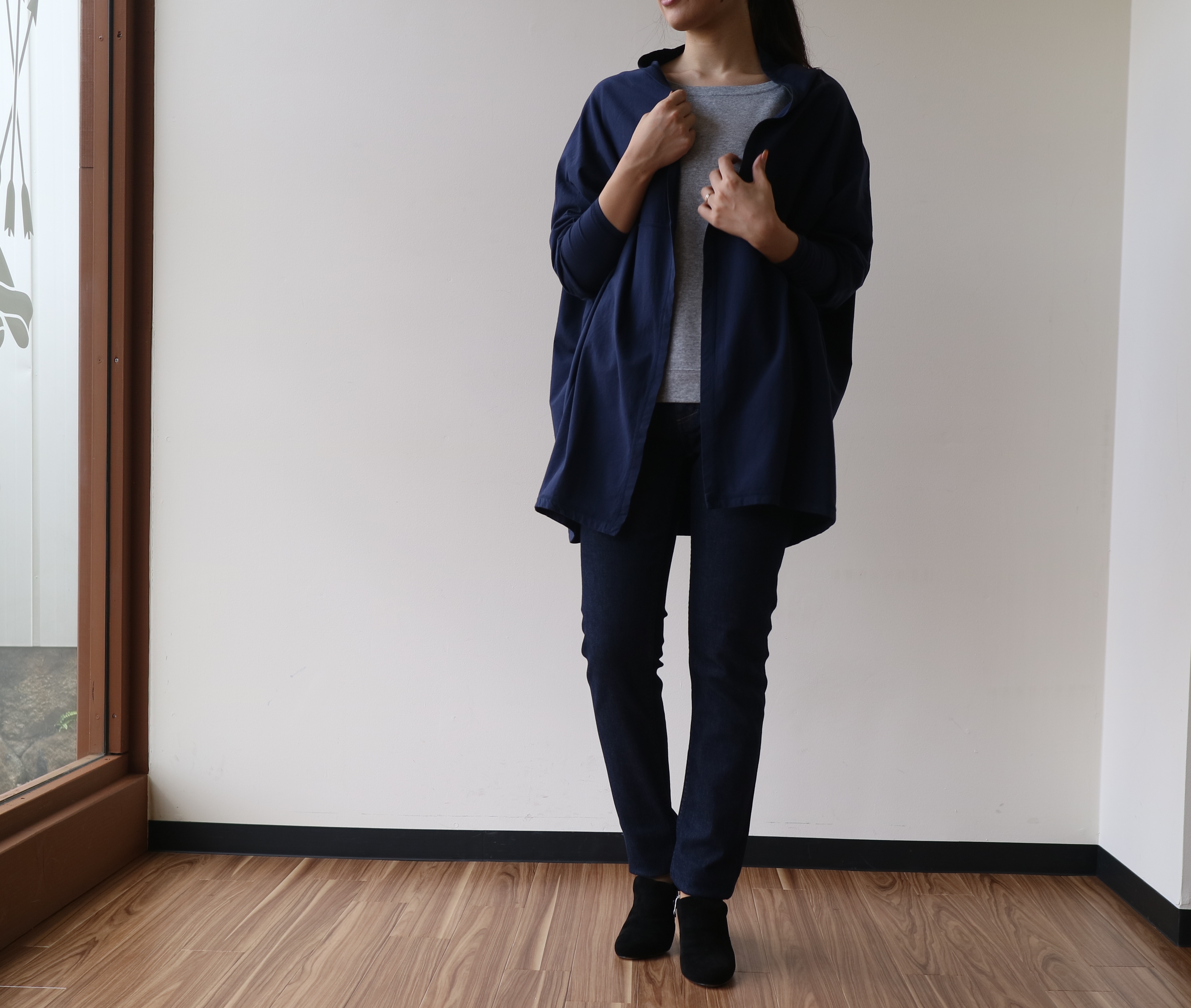 もうひと型は、ミディアム丈のカットソー。ウエストより少し高い位置に切り替えがあるので、ラインが綺麗に見えます。薄手の生地なのでちょっとしたお出かけや、気温調節の一枚にバッグに忍ばせて頂けるカットソーです。