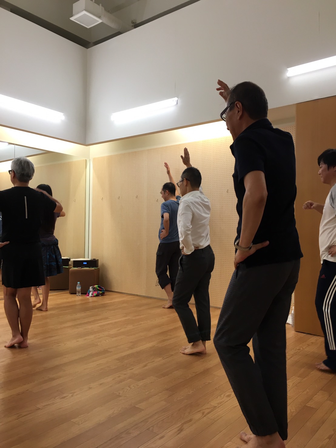 軽いストレッチの後、ステップの練習です。誰もがフラを体験するのは初めてですが、番頭のナグラサン(中央の白シャツ姿)だけは妙にリズミカル。業務を終えての途中乱入なのに、ステップの基本を教えてもらっていないのに...、なぜかリズミカル。腰のフリが全く違います。というのも、彼は10年ほど前にサルサに夢中。ラテンの乗りですが、同じ音楽に合わせての踊りだけに、ここぞとばかりに軽快にステツプを踏んでおられました。先生の瀬尾さんもびっくりです。