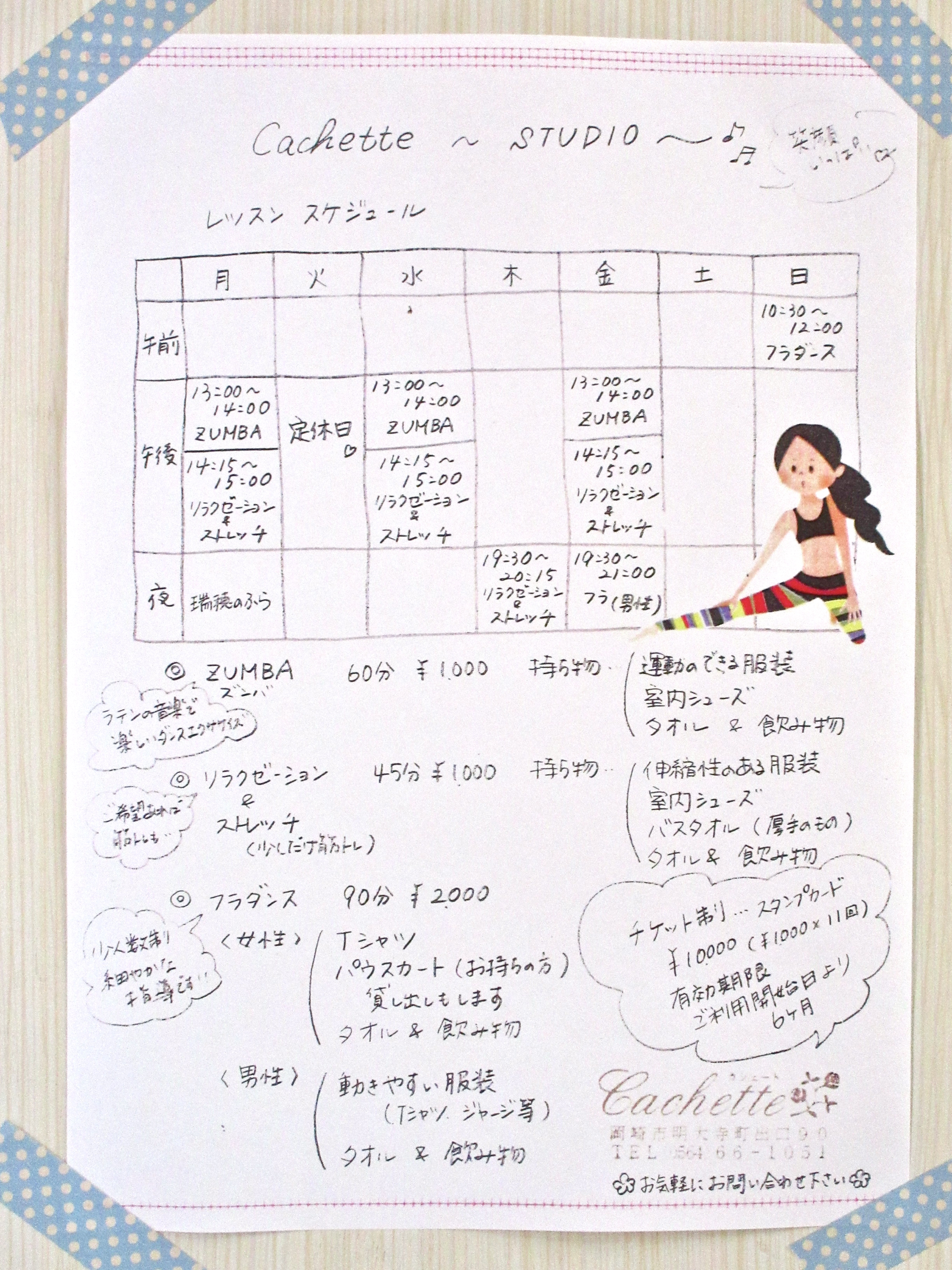 現在、カシェートスタジオで行われている教室です。ぜひ、時間を作って参加してみてください。自然に幸せな気分になっていくのが分かるはずです。