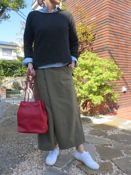本日は、そんなほっこりするニットのご紹介を。ベーシックなチャコールグレー、優しい雰囲気のクリーム、コーディネートの主役レッドの三色で入荷した【le ciel de HARRISS】のクルーネックニットと変形カーディガンをコーディネートでご紹介します。