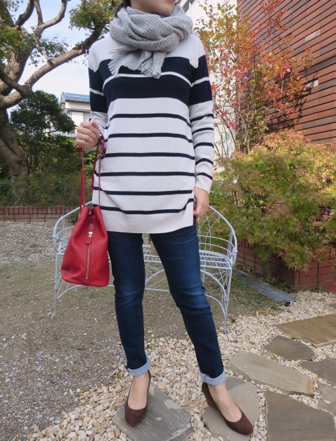 定番のボーダーですが、胸元の太めのボーダーが視線を上に持ってくる視覚効果を発揮してくれます。ヒップラインが隠れる長さもポイント。カシミヤ混なのでふんわりした肌触りです。