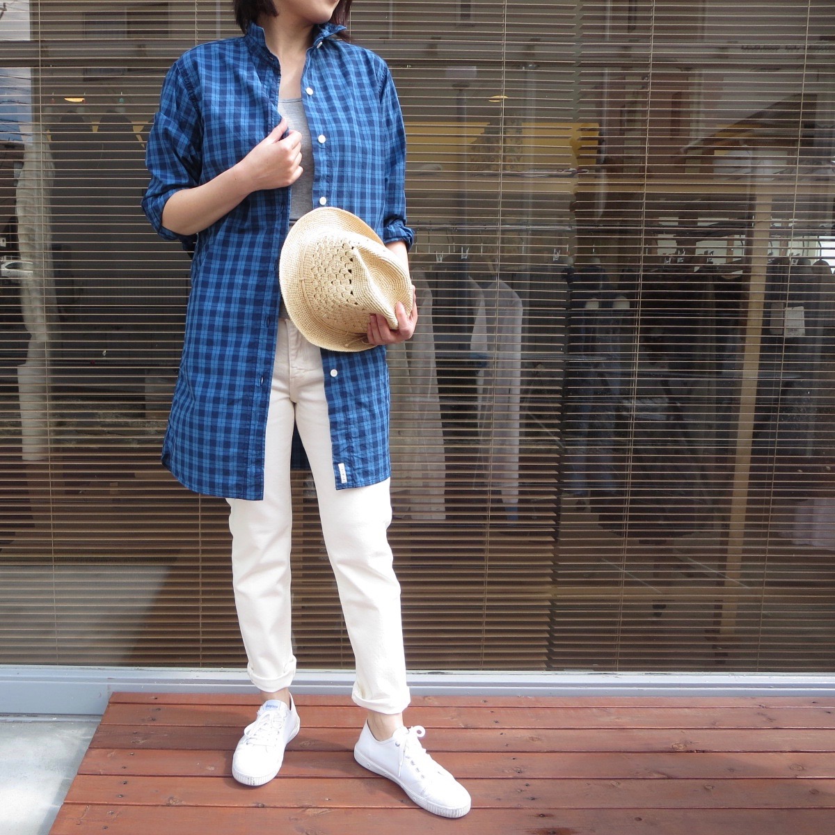 まずはシンプルに、ホワイトデニム&スニーカーと合わせ、今すぐにでも着て欲しいコーディネートで。肘までお袖をまくることで、ぐっとカジュアル感がアップします。