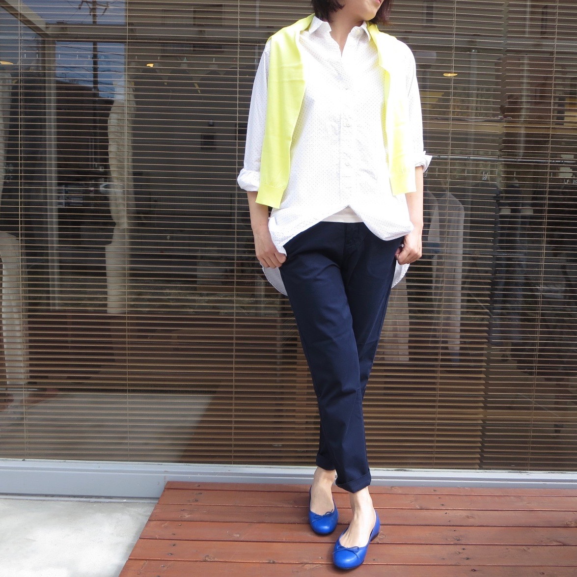そして、ホワイトはミニマムサイズのドット柄でセレクト。遠目には無地に見えるので、無地感覚で着ていただけます。