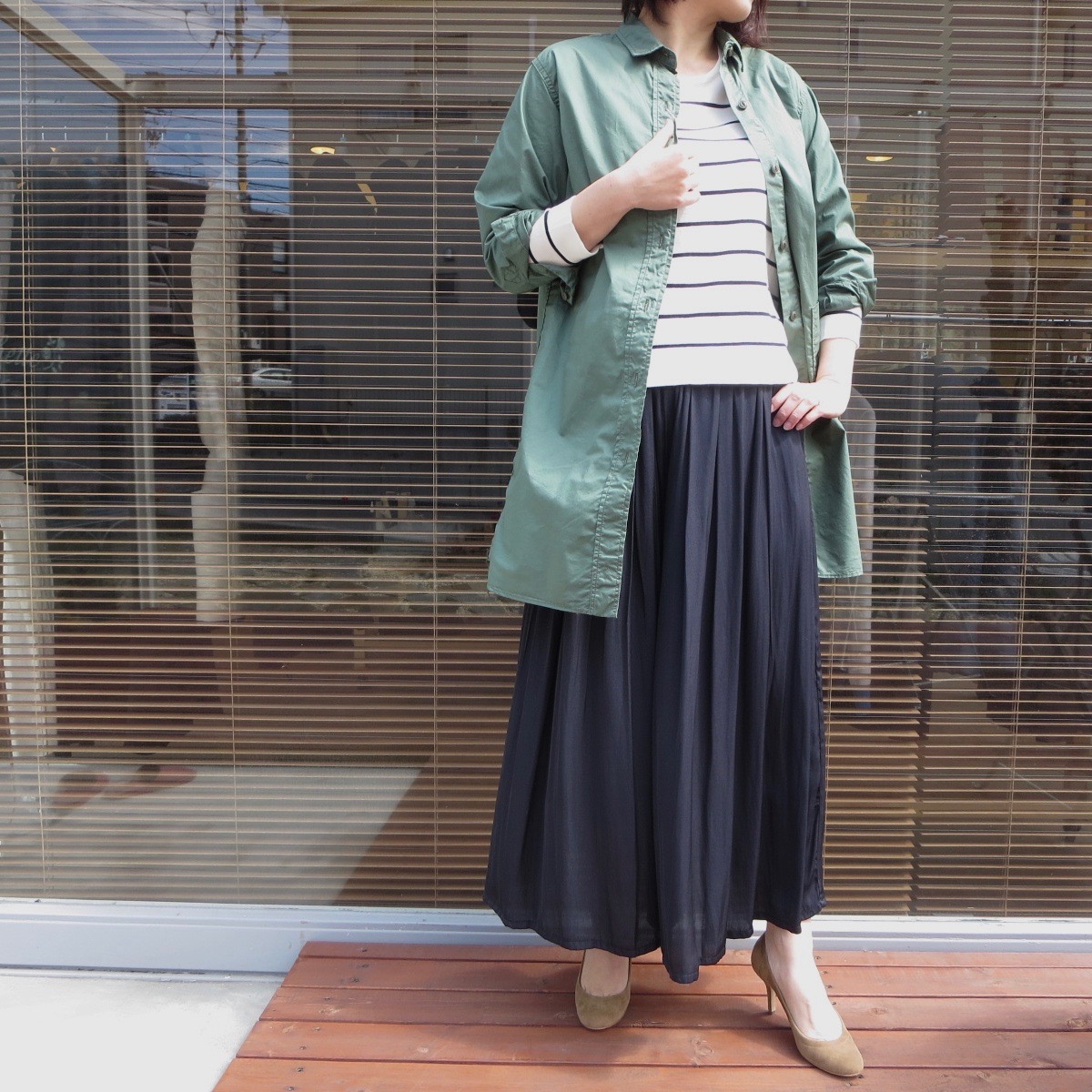 そして本日最後のご紹介は、少しハリ感のあるカーキをスプリングコート代わりにしてスカートに合わせてみました。もちろん、ボトムスにインして、ビックシャツ×ボリュームスカートで今年らしいシルエットでもOK!