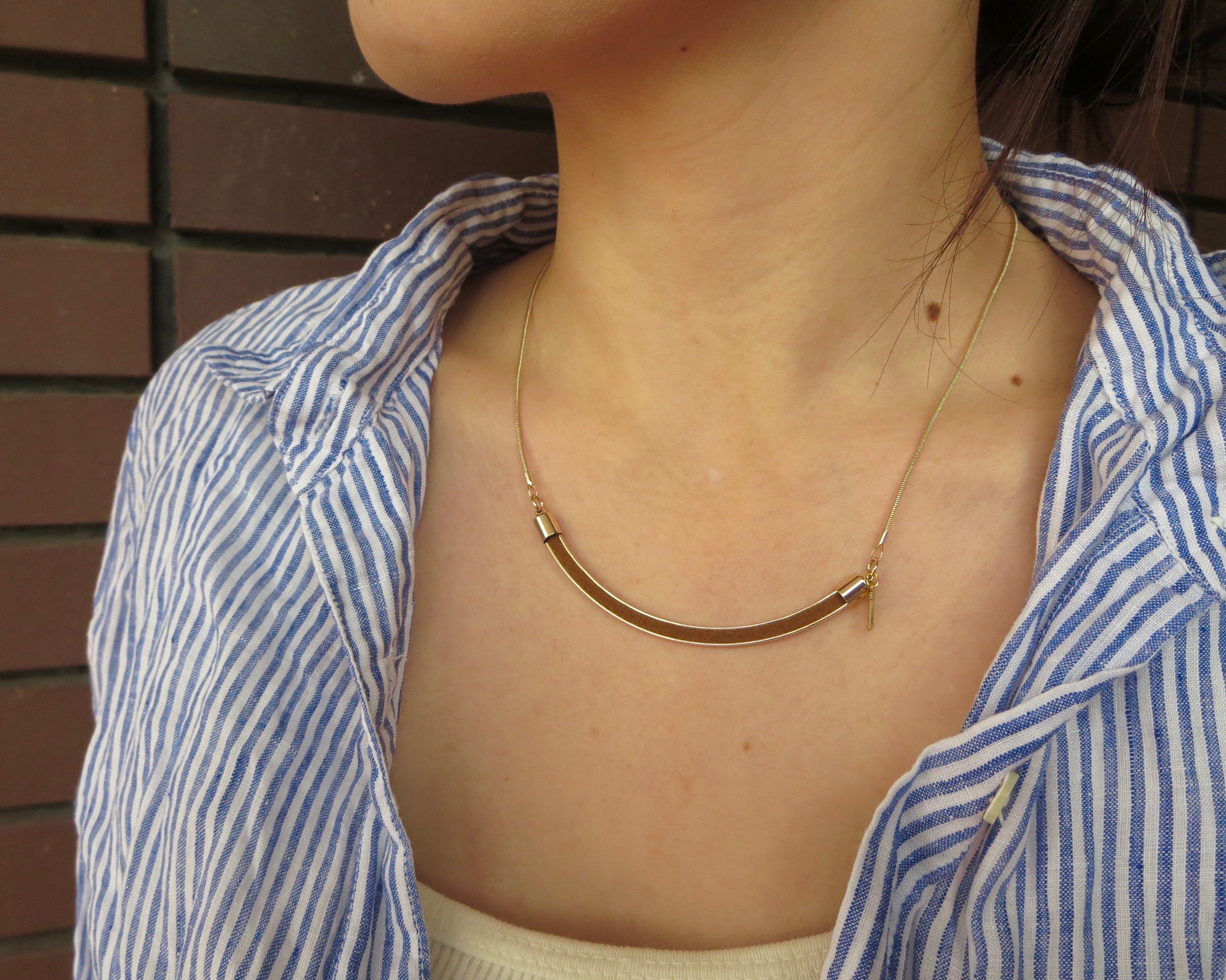 こんな感じで、首元の開いたシャツやカットソーに付けるのにちょうど良い長さ(40cm~45cm)です。ちょうど鎖骨下になるので、気になる首元をうまく演出してくれますね!