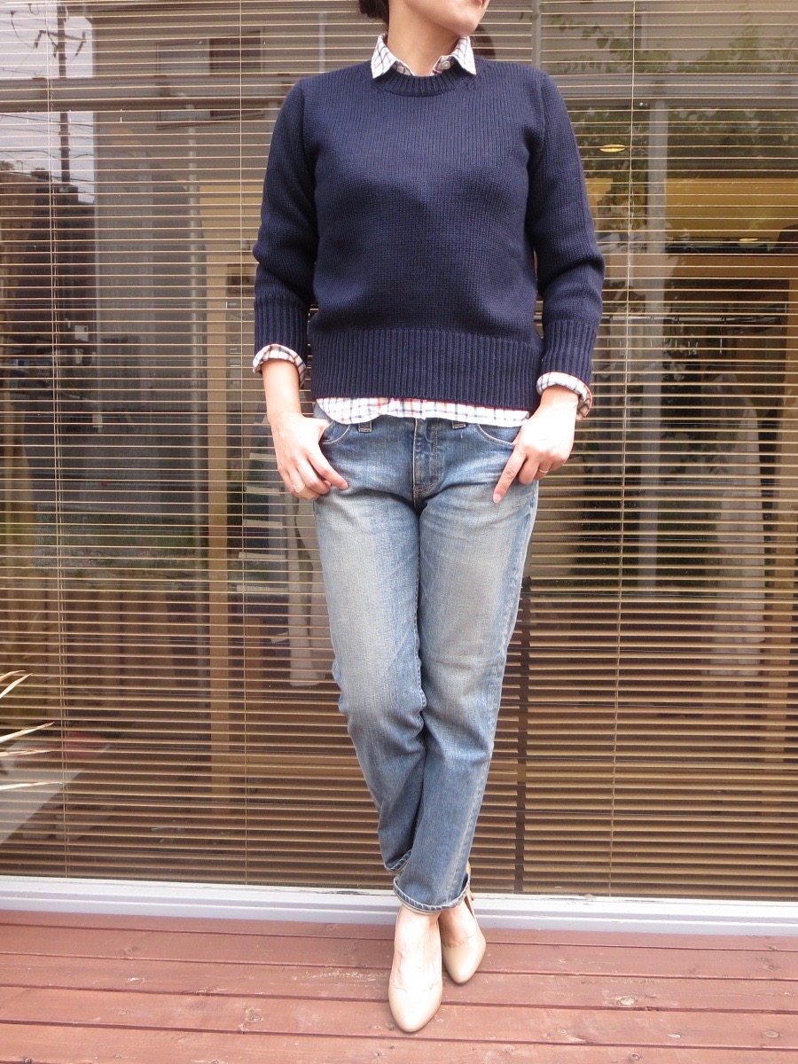 ネイビーに変わるだけでよりスタンダードですが、シンプルなのにどこか今っぽく見えてしまうのは、不思議ですね。着丈が短めなので、シャツをインしても素敵です。