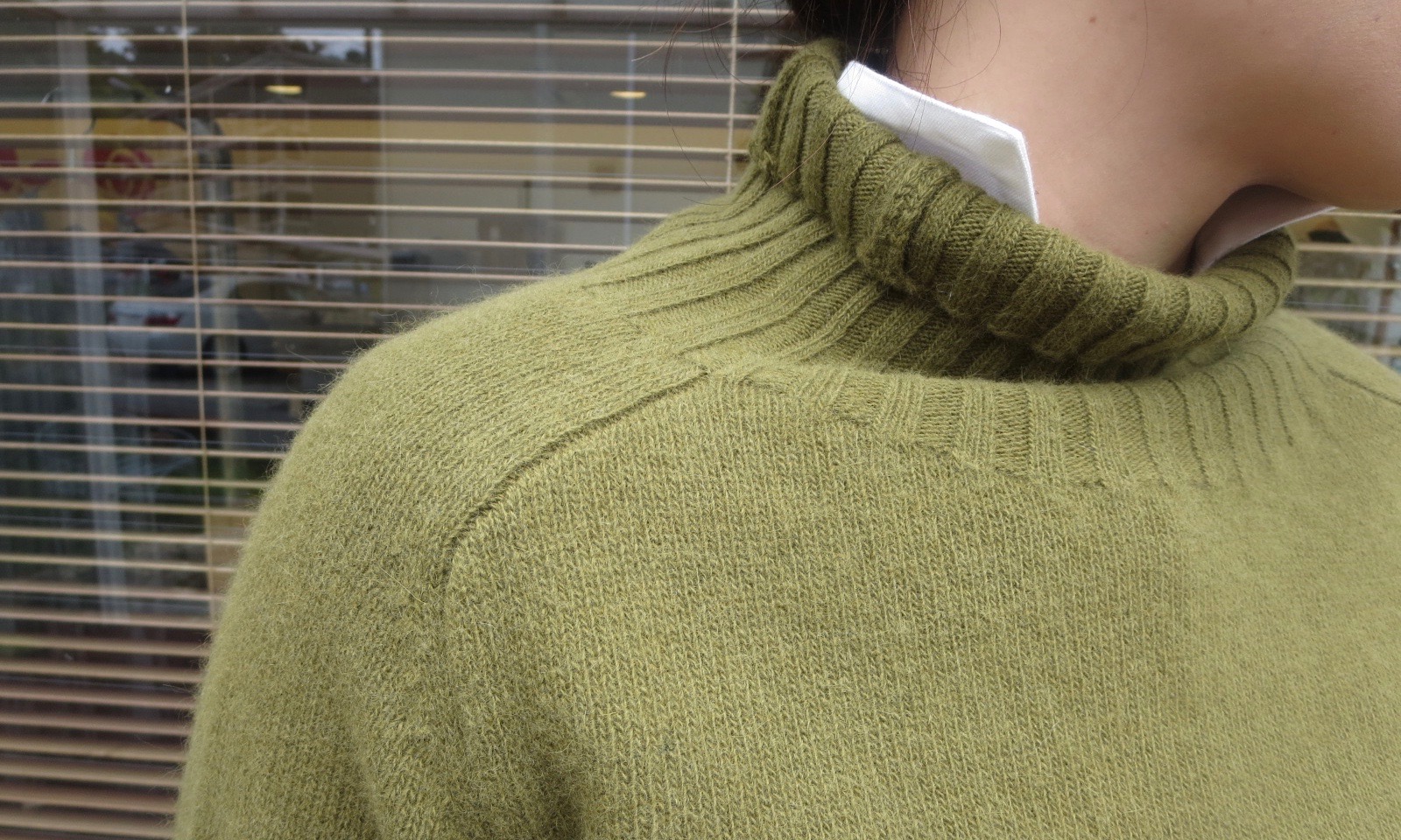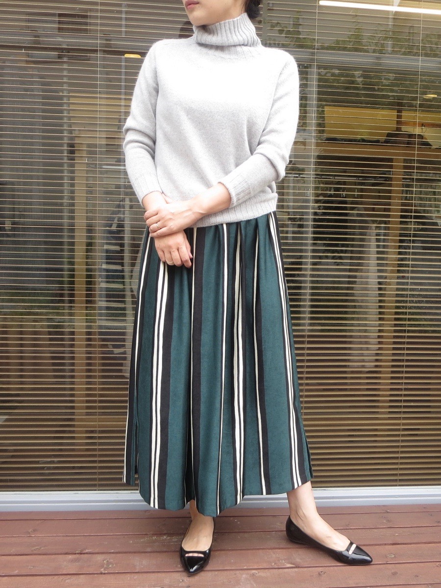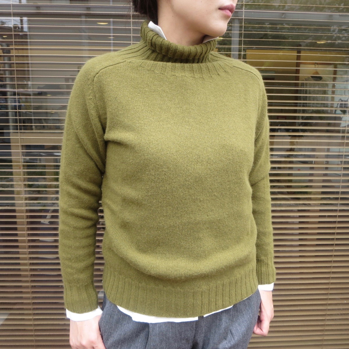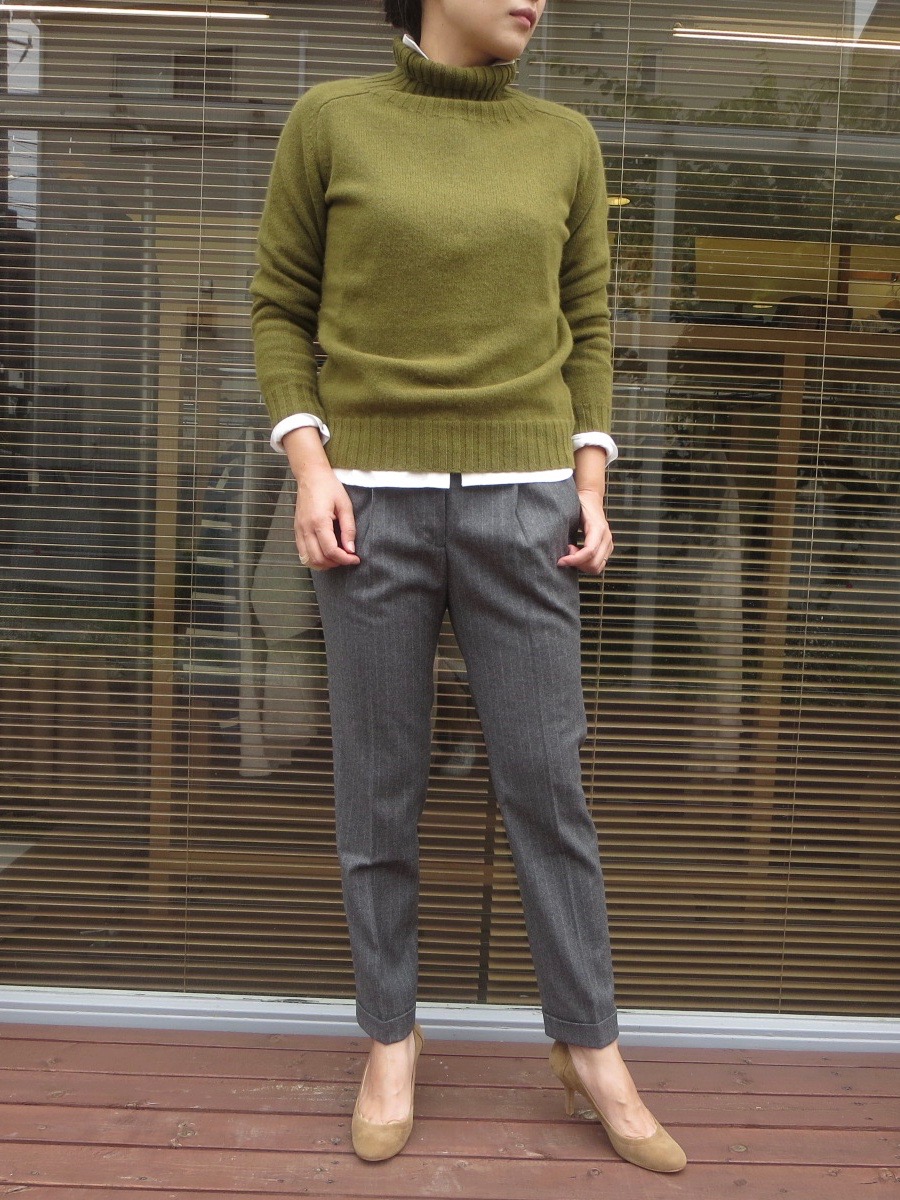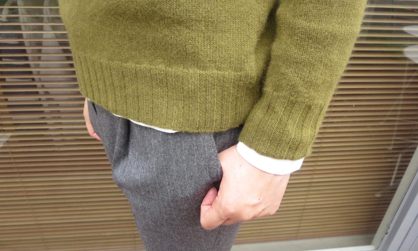 抹茶を思わせるような、深みのあるグリーンはとても新鮮なカラーで、コーディネートの主役に慣れるニットです。