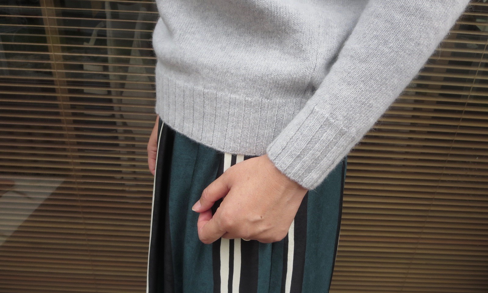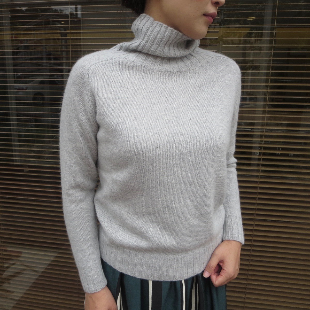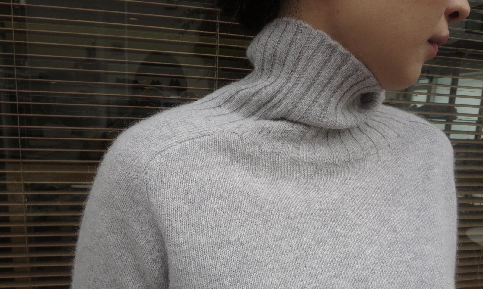 程よい肉厚感で一枚ではもちろん、冬のコートのインナーとしてもかさばりません。明るいグレーは、暗くなりがちな冬のコーディネートの顔まわりをぐっと華やかにしてくれます。