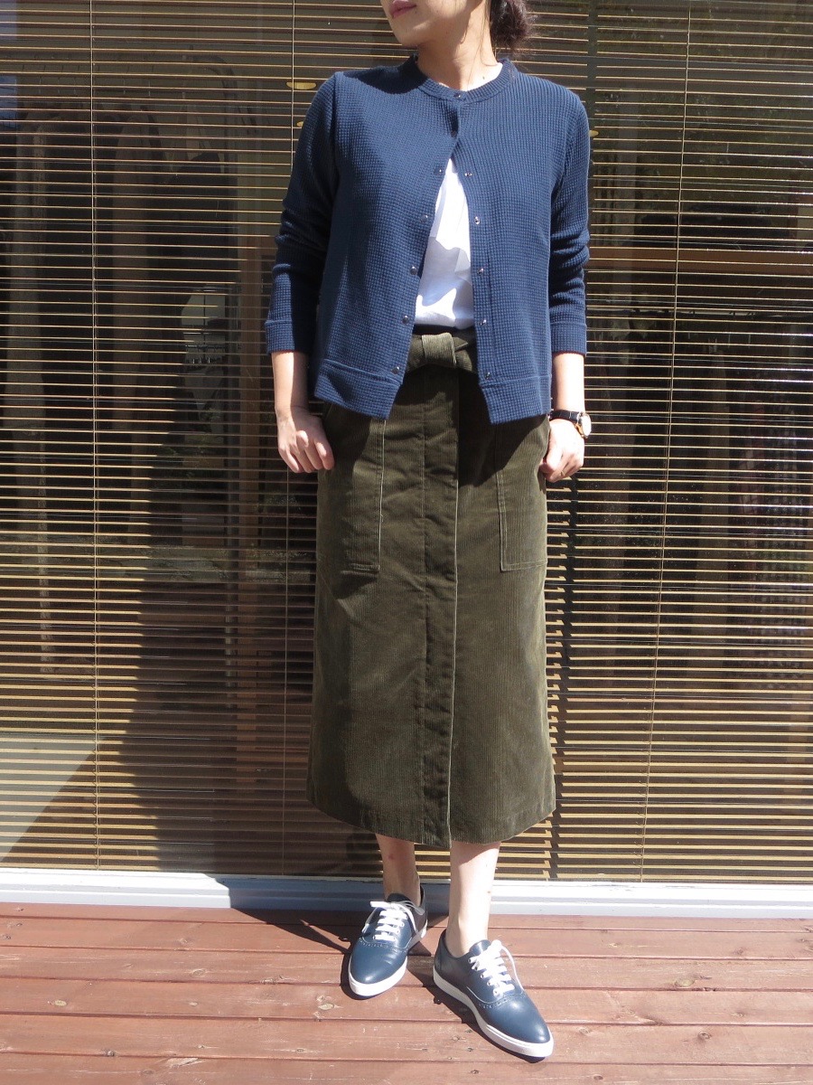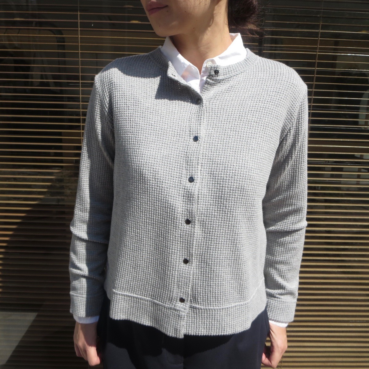このカーディガンの一番のポイントは、ワッフル生地のように凹凸のある素材です。綿100%でシンプルになりがちですが、この凹凸感のおかげで表情に奥行きが出ますね。