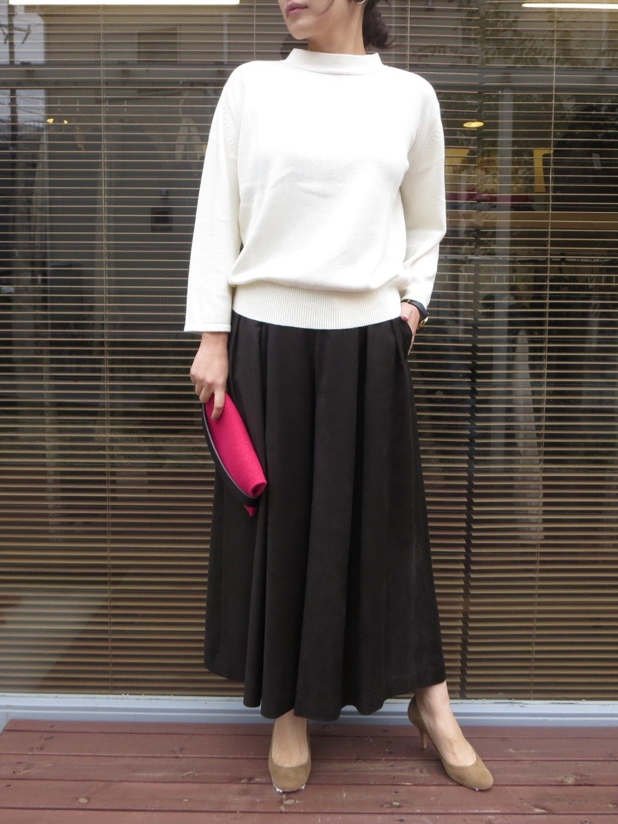 白が眩しいニットは、秋冬のトーンダウンしたコーディネートに、明るさをプラスしてくれます。裾がリブになっていて、普段インするのがどうも苦手という方にも、すっきりと収まるので安心です。また少し立ち上がったネックが、小顔効果にもなっています。