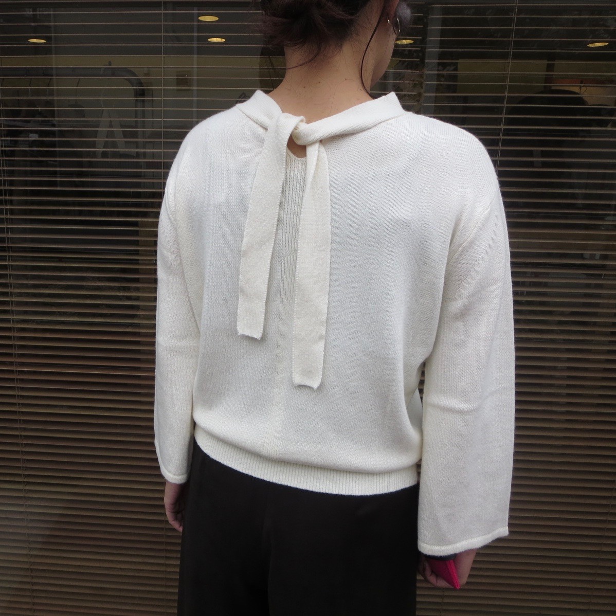 このニット一番のポイントは、後ろのリボン。今回のように軽く結ぶだけでもいいですし、可愛いのがお好きな方は、リボン結びしていただいても。