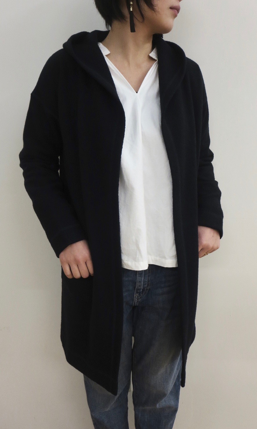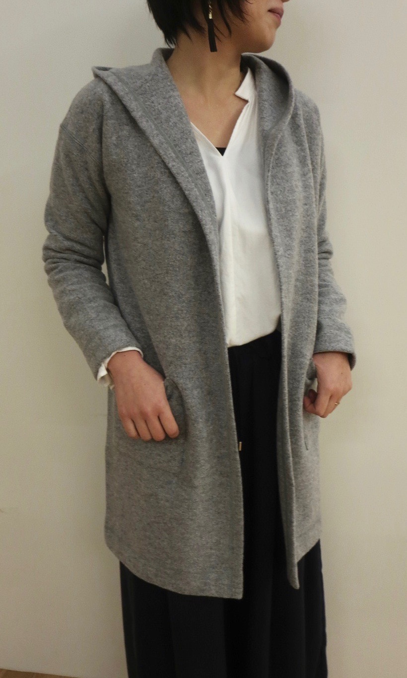 フードつきのロングカーディガンは、首元が綺麗に見えるので小顔効果も期待できます。着丈の長さも絶妙で、ボリュームのあるボトムでもすっきりと合わせられます。